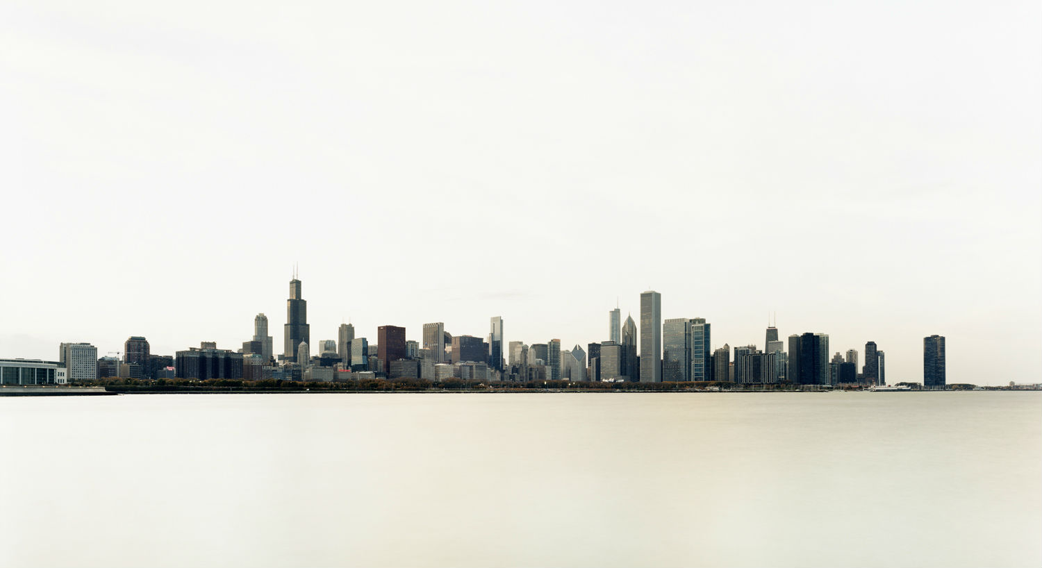 Though no two images in the exhibition are the same, they are all rendered equivalent, to a degree, by Leong’s compositional device. Whether looking at chalky red earth dotted with feeding animals, a group of anonymous suburban houses nestled in a sandy, unfinished development, or the gray skyscrapers that sprout from the shores of Chicago’s Lake Michigan, the viewer’s eye is constantly drawn to the bifurcating line that divides sky and land. In programming the field of vision in this way, Sze Tsung Leong strips the world down to top and bottom, making it seem smaller. This quality is accentuated by the images’ uniform palette of muted colors. Any given photograph is likely to depict woolly cloud cover hanging over Velcro-textured tan grass or silky gray ocean, regardless of the continent on which it was taken. As the exotic coalesces with the recognizable in continuous landscape, foreign places become more familiar. Continents connect as ancient terrains blend into modern cities.