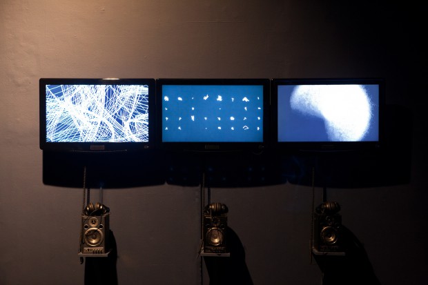 To this end, Kynan Tan’s Multiplicity is a hypnotic suite of screen works in which the numeric is translated through visual and auditory filters. Mathematics, that abstraction both simple and complex, is rendered through animations, data visualizations, and computer-generated sound. The result is a graceful interplay of electronic sound and digital imagery. Despite its elegant formalism, the series allows slippages between abstract and representational, near and far, conjuring atmospheric, cinematic, biological, and geographic associations. Neuron-like clusters of lines are disrupted by television static; vast, sweeping sounds trace the form of mountains; and the frenetic lines of global communication are exposed.