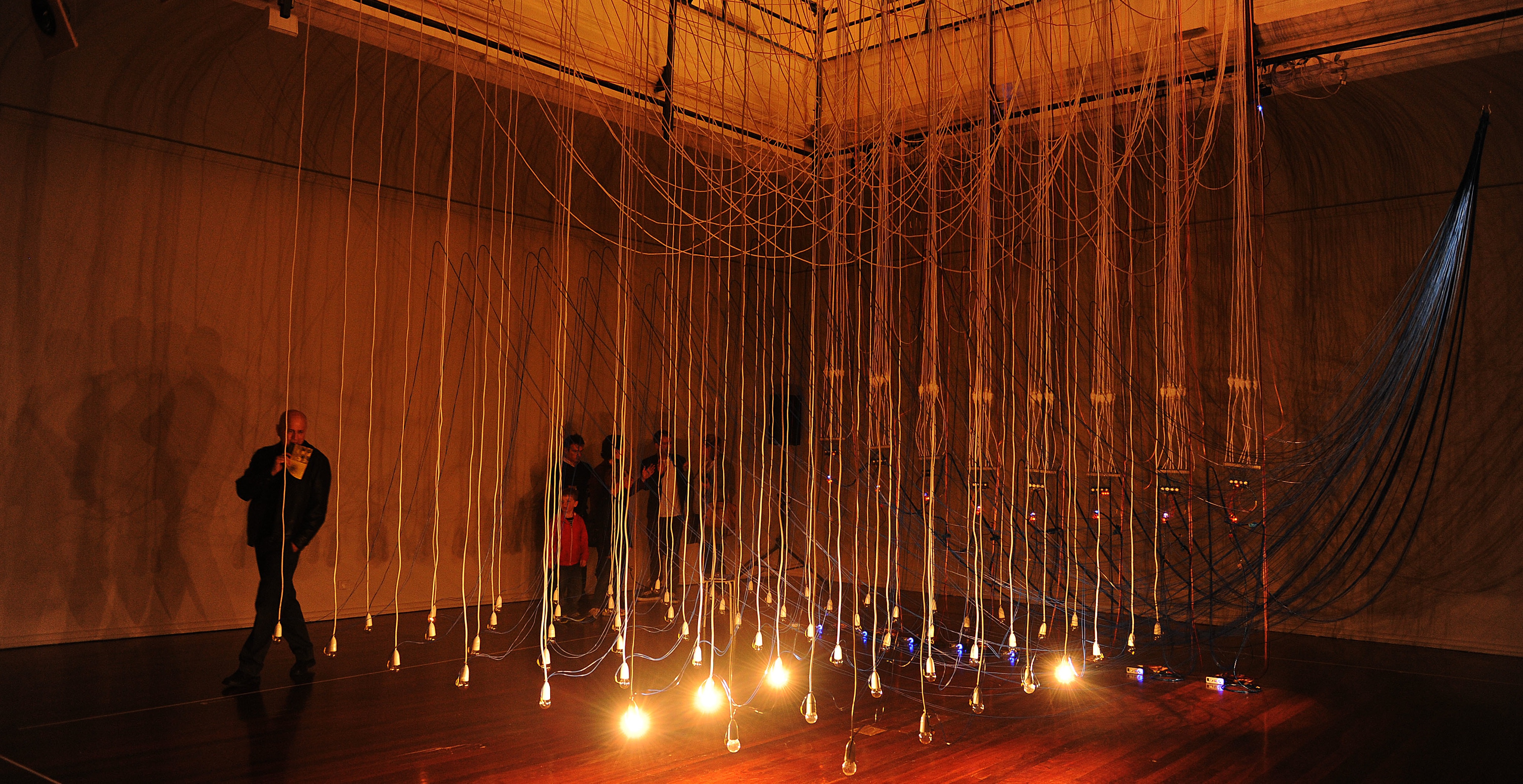 Matthew Gingold. Filament Orkestra, 2014; 64 light bulbs, 64 light-dependent resistors (LDRs), 8 Ardunio Fio, 8 FM radios, 8 Lepai 2020 amplifiers, 16 Tang Band W5-1611SAF 5-in. full-range speakers, 4km AC/DC wiring; installation view, What I See When I Look at Sound, PICA. Courtesy of the Artist. Photo: Toni Wilkinson.