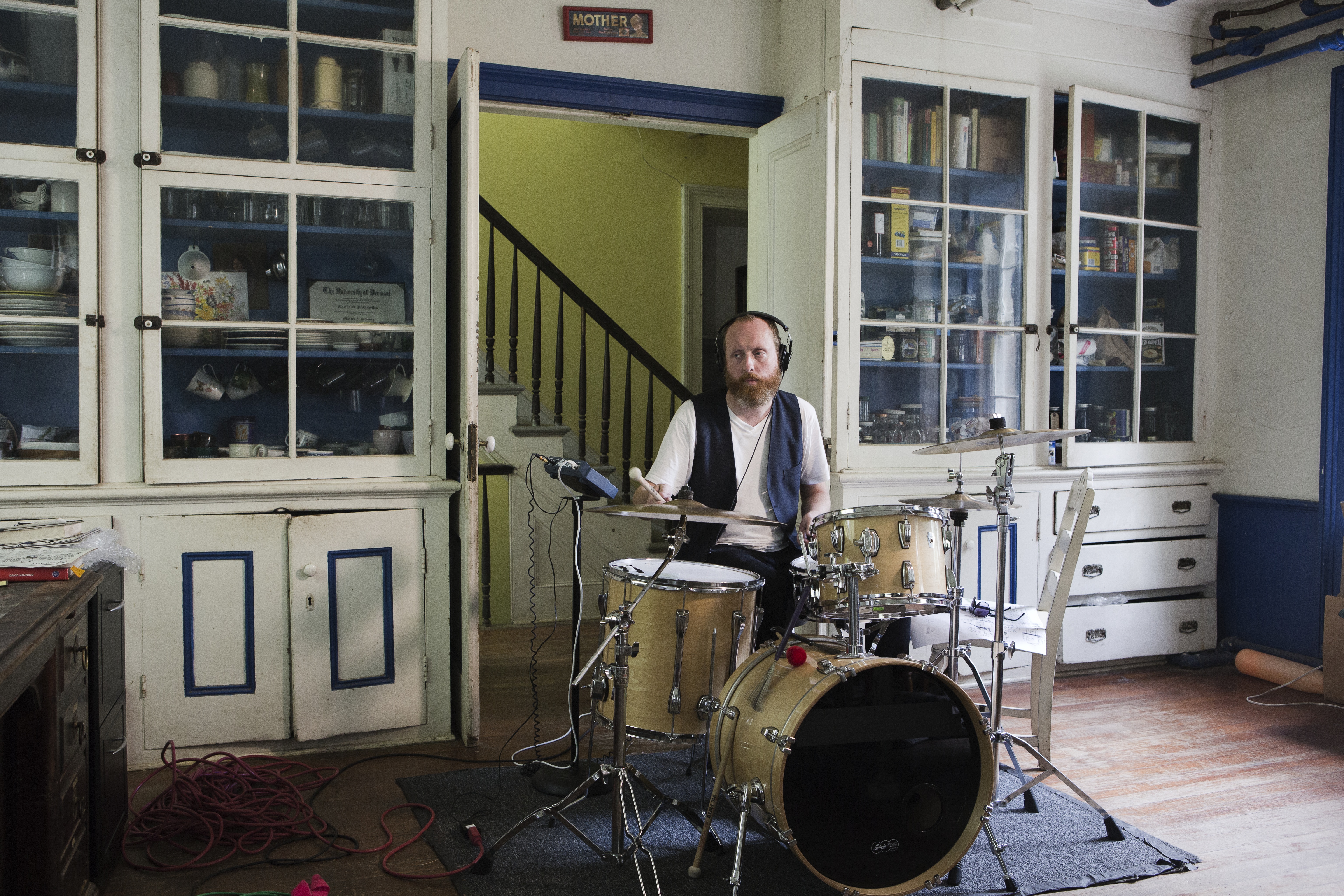 The Visitors is a recording of a group of musicians—all friends of Kjartansson—playing on Rokeby Farm in New York. At the time of filming, the artist was going through a divorce and was blindsided by reading his wife’s poetry. He started writing music to fit one of the poems; maybe it was a way to deal with his own defeat, maybe to just have a last moment with his wife by adopting her work. He saw the opportunity to bring together his friends and created a family-reunion-like atmosphere on the farm. Kjartansson selected people, but not the instruments they would play. The group played music in the house for a week, trying out different things for the song “Feminine Ways,” and scheduled the cameras, headphones, and everything else around filming (including a cannon fired twice) in one take at sunset.
