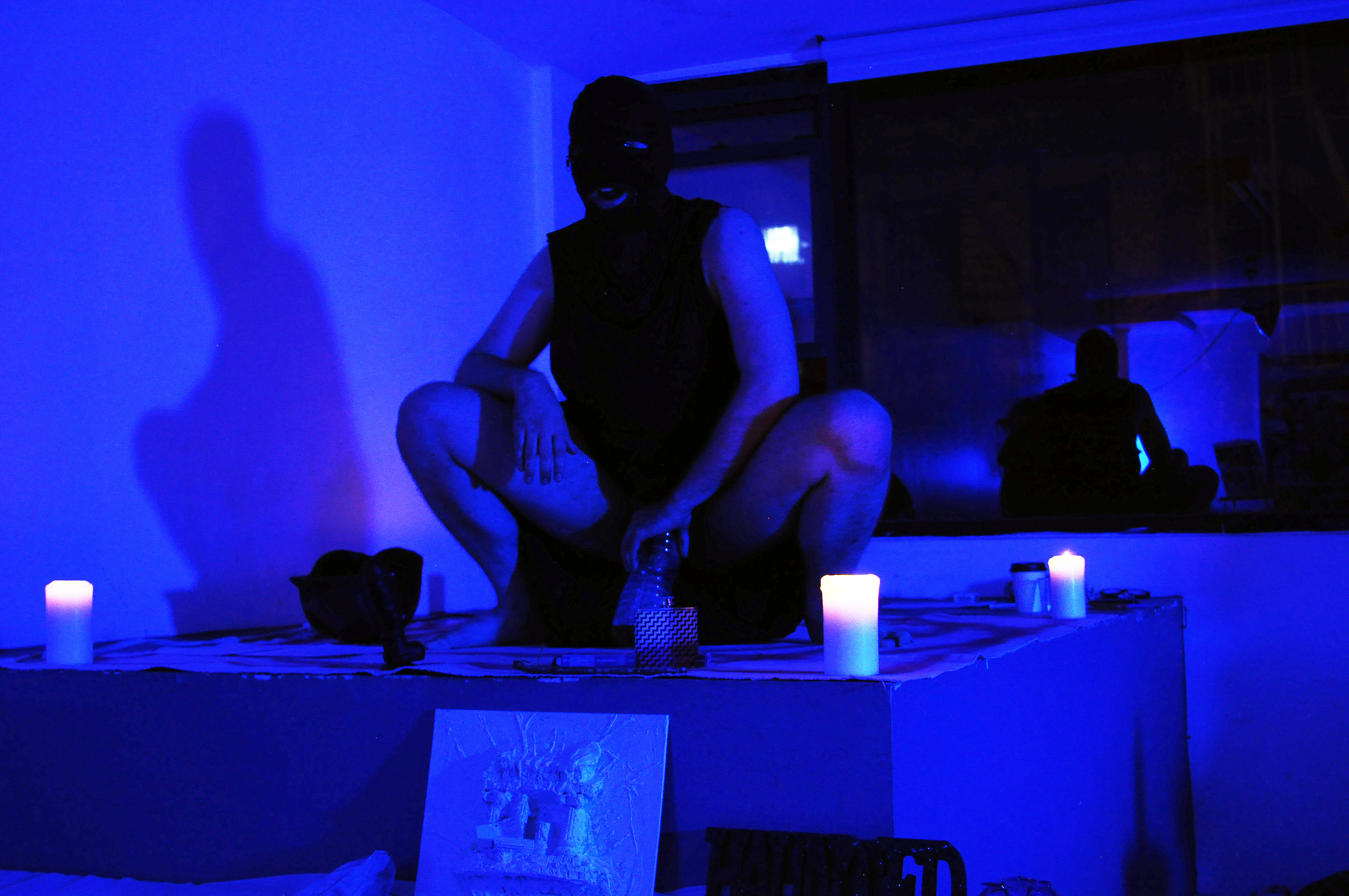 Barnett’s performance successfully implements the refined tools of traditional theater (including the power of camp, of character, and the allure of a compelling story), but the most significant aspect of her “play” from a theoretical standpoint lies within two particular actions that fissure the fiction of his storytelling. “Simon,” the meth prophet, looms atop a red square sigil, terrifyingly obscured behind a cloth gimp mask, delivering diatribes about the blazing, apocalyptic landscape of a queer dystopia. During one such tirade, Barnett forces a viewer to stand on his sigil and charge an unlit match with energy and “an intention.” During a commercial for Barnett’s premiere performance staged at The Bureau for General Services Queer Division in August, the participant lights the match and Barnett—we are suddenly snapped into awareness that it is Barnett herself who performs the action—stubs it out on her own flesh. At the performance’s full premiere at United Solo Theatre Festival, the participant’s match remains unlit and Barnett eats it. The next move is gross, fetishistic shock value: as Simon offers up a prayer in ritualistic homage to self-destruction and the ingestion of one’s own filth, one’s own trauma, the character pisses in a glass and drinks his own urine.