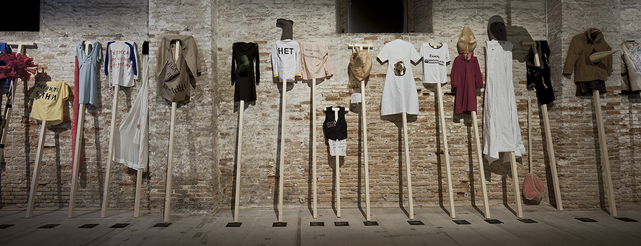 GLUKLYA/Natalia Pershina-Yakimanskaya. Clothes for the demonstration against false election of Vladimir Putin, 2011-2015; 56th International Art Exhibition – la Biennale di Venezia, All the World’s Futures. Courtesy of la Biennale di Venezia. Photo: Alessandra Chemollo.