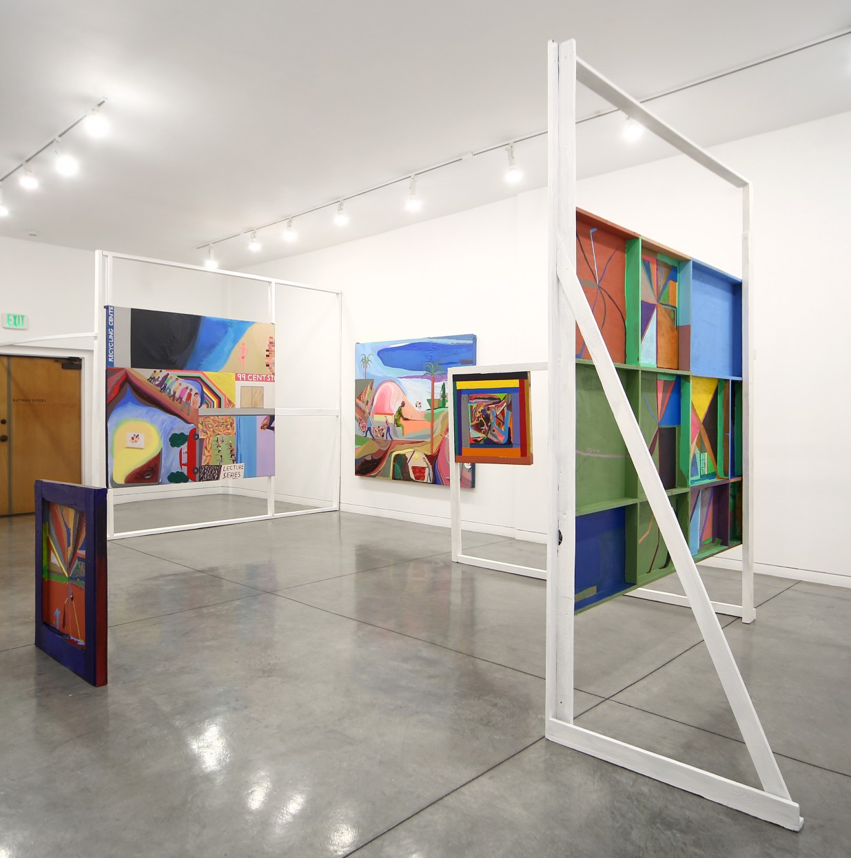Given the cartoonlike basis of most of his portrayals, the slackerly compositions, and the seeming arbitrariness of the surface textures of the paint he uses so dynamically as a set of color choices (seemingly clumsy elements that have often been similarly deployed by other artists who might pass as “outsider,” however relative that term might be), the question arises as to why Johanson chooses to so often paint rather than draw. In these pieces Johanson doubles down on painting in several ways: first, through the large scale of several of the scenes, as with Lecture Series/Abstract Mass, and the bleak consumer composite suburbia of Los Angeles with Pills. Johanson paints on repurposed wood panels and displays most of his work in awkward, large, built wooden armatures to show off both fronts and backs equally (as he has done even more elaborately in installations elsewhere). This prominently shows off the wooden buttressing behind the panels, which he also highlights with “secondary” paintings on the reverse. These include what look like a series of painted geometric doodles mosaic’d on the back of one larger composition, a simple set of color fields of darker and lighter brown parceled out by the different wood elements themselves, and what looks like a beginning painted sketch of an abstract landscape not so dissimilar to what might show up elsewhere as just one among many background components in a “primary” or finished painting by Johanson on the front of one of his panels.