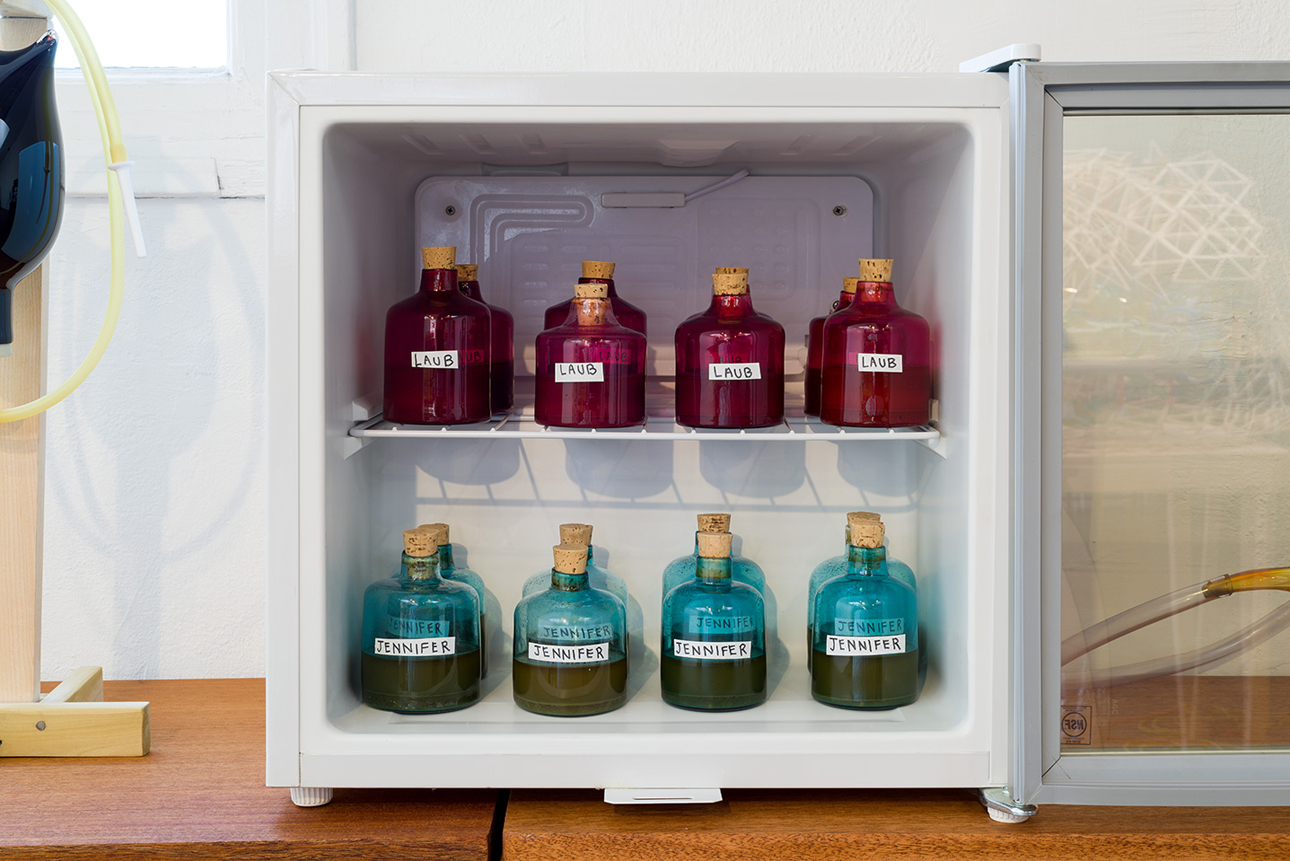 Jennifer Moon. GFT (Gut Fairies Transplant), 2015; mouth blown glass, wood, vinyl tubing, fecal matter, condom, ass-wipe, rocks, sand, charcoal, filtered water, corks, Prehnite with Epidote crystal, Blue Calcite crystal, Smoky Quartz crystal, refrigerator, inkjet prints, cardboard, construction paper, foamcore, fabric, folding table; 2 parts: approx. 64 x 275 x 21 in.; 77 x 48 x 24 in. Courtesy of the Artist and Commonwealth & Council, Los Angeles.
