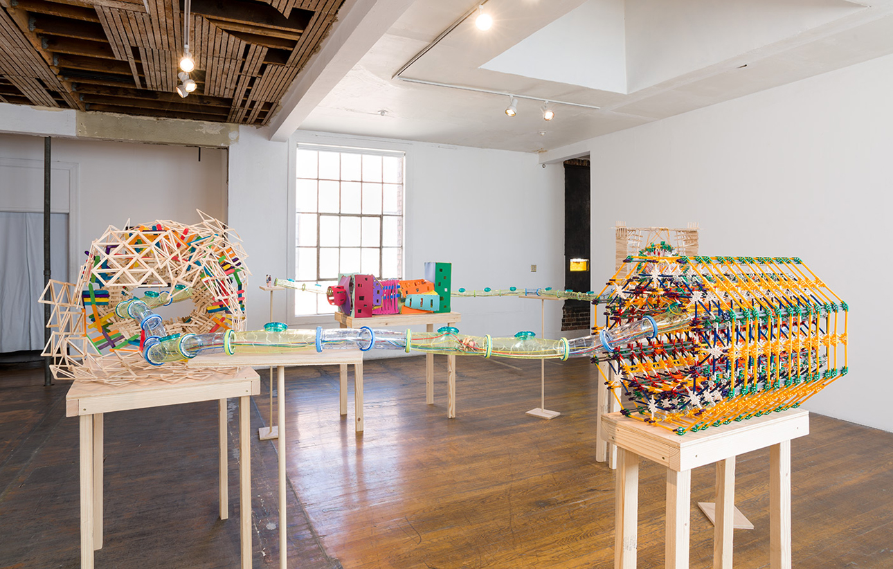 Jennifer Moon. JLS (Jennifer Laub Smasher), 2015; K’NEX, Habitrail tubes, Popsicle sticks, foam sheets, ceramic 3D print figurines, electrical wire, electrical tape, dental floss, hemp, duct tape, wood, inkjet prints, cardboard, construction paper, foamcore, fabric, folding table; 2 parts: approx. 68 ½ x 156 x 152 in.; 77 x 48 x 24 in. Courtesy of the Artist and Commonwealth & Council, Los Angeles.