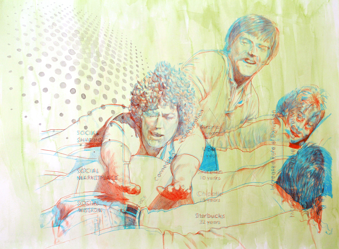 Robby Herbst’s work also reflects a disconnect between idealism and how it is manifested. His series of colored pencil and gouache drawings depict scenes from the New Games movement of the early ’70s. Conceived as a non-competitive, community-based alternative to traditional sports, the first New Games Tournament was held in 1973 in Marin, California, ground zero for post-hippie New Age humanism. Herbst has rendered activities, like Hug Tag or Parachute Games, in luminous cyan, red, and yellow, with an illustration style reminiscent of progressive books of the time, such as The Joy of Sex. The colors don’t line up, giving the impression of an off-register printing press. The sensation of something being amiss is echoed by the intrusion of technological symbols in these bucolic images of teamwork. Some are a bit heavy-handed, like an iPhone hovering over a shaggy-haired group engaged in an amoeba race. In other pieces, Herbst nails the manner in which the inclusive, nontraditional culture of the Bay Area gave rise to an entrepreneurial tech industry that has co-opted the very values that made it possible. (How else to explain a company whose motto “Don’t Be Evil” seems sharply at odds with its decision to support the NSA’s far-reaching surveillance plan?) Across an image of people bodysurfing, Herbst has overlaid a corporate graphic that charts various stewards of the new economy, such as Airbnb and Uber, against an axis labeled “Increased Rate of Disruption.” Ironically, the chart bears some similarity to Moon’s explanatory panels, though containing vastly different notions of disruption.