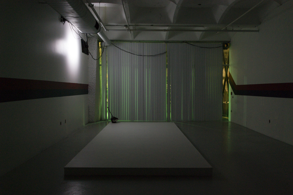 In the main gallery, the viewer is introduced to a series of sculptural works relating to Hope’s past cultural allegiances. Only open during evening hours, the installation is experienced in the dark, with the sole sources of illumination emanating from two works: Untitled (Living Room) (2015), an ambient green glow that peers through the gallery’s vertical blinds from outside the gallery, and Untitled (Journeys) (2015), a single monitor, playing music videos on loop, that faces a wall and produces an inconsistent haze. These two works provide an immediate environmental context for a viewer to access time as a static placeholder in a seemingly abandoned space.