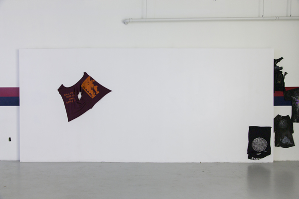 The core elements of Hope’s sculptures are residual constructs of highly marketed media material from mid ’90s horror-core and industrial bands like Insane Clown Posse and KMFDM. Installed sparsely on the wall, Untitled (T-Shirts) (2015) is made from a selection of largely destroyed T-shirts that Hope once wore while attending shows. The shirts are individually sealed with Mod Podge and are transformed into artifacts symbolic of earned identity. Once a well-worn stand-in for self expression, the shirts are now inactive sculptural relics that exist alone within memory and time.
