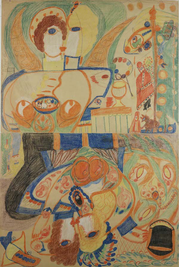 Aloise Corbaz. Baptême de Pie XII / Un Baiser à l’Aviateur – Le Pape Pie XII Monnayeur et son Sphinx sur le Siège (Baptism of Pius XII / A Kiss to the Aviator—Pope Pius XII Counterfeiter and His Sphinx on the Seat), c. 1955; colored pencil on a sheet of paper folded in the middle; 59 x 39-3/8 in.; De La Rosière Psychiatric Hospital, Gimel, Switzerland. Collection de l’Art Brut, Lausanne, Switzerland. Photo: Olivier Laffely.