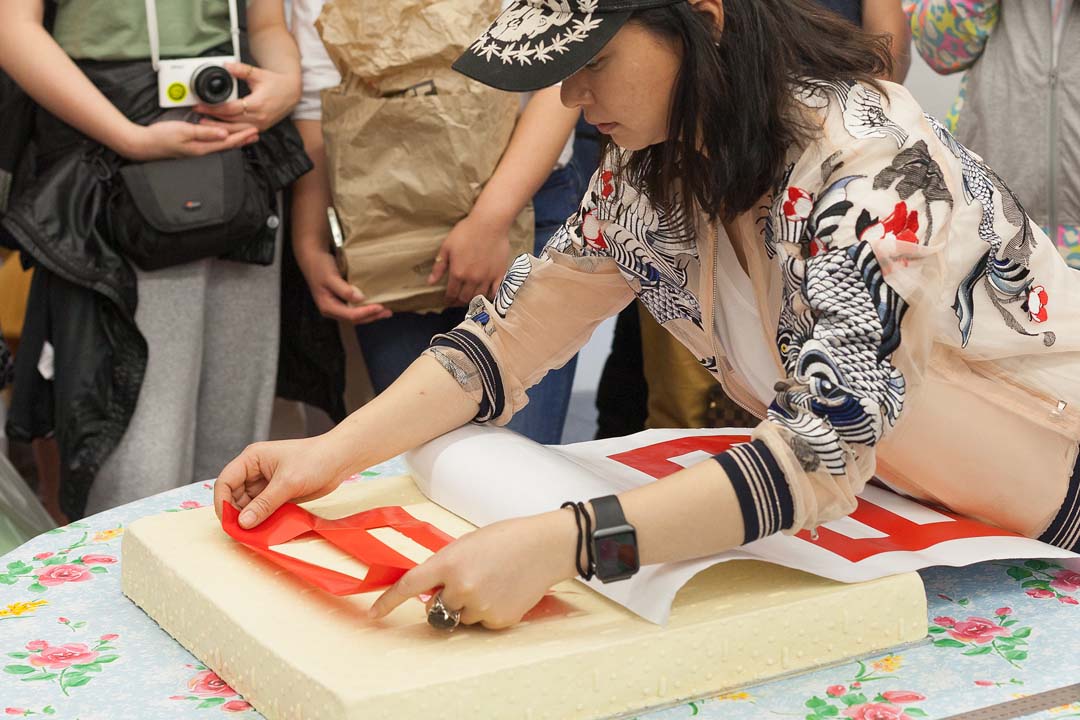 On the ground floor of 4A’s gallery space, banks of televisions and screens display the resulting videos. At the exhibition’s opening, the artist demonstrated tofu carving, working with a large block of firm tofu set out on a table covered by a cheerfully domestic floral tablecloth. For Chen, her chosen medium of tofu, one of the oldest and most commonly used ingredients in Chinese cooking, is both personal and universal. It speaks of domesticity and childhood memories of home, but it also references the inevitability of decay and disintegration, becoming a potent symbol of the traumatic change experienced by Chinese citizens in recent years. As recipes are handed down from generation to generation, often with family members spread across the globe, tofu also becomes a metaphor of migration. Chen identifies a kind of alchemical process operating here; one kind of raw material is transformed into another by intensive labor.