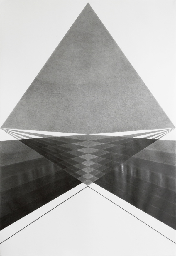 Diagrama [Diagram] (2015), a series of twelve drawings, sets this initial dialogue around the placement of space with the exhibition’s recurring elements of monochromatic dimensions, perspectives and shadows in search of interconnected paths, and the brief and everyday, which are given importance. Made with graphite on paper, Libertad’s drawings evoke constructive geometries within a devoted process. The intensity of lines varies as the artist generates a deck of spatial possibilities. Whereas this universe seems calculated, firm, and steady, two adjacent photographs stand as counterweight, portraying natural elements in ephemeral circumstances. As its title remarks, Rama, Sombra [Branch, Shadow] (2015) captures a curvy tree branch that is balanced on the ground. Thanks to the branch’s arched position, the shadow projected against the pavement completes an oval. The photograph emphasizes the dichotomy between the present and the missing—an ambiguous feeling that lingers throughout the show.Through the obsessive repetition of patterns and structures, Libertad confronts negative and positive space in a series of 196 drawings, Formas y Espacio [Shapes and Space] (2015). Pinned directly onto the gallery walls, the drawings are organized into pairs; contour line drawings of geometric compositions are paired with their counterparts, which reproduce the same shapes but with spaces filled in. The graphite is applied with such strength and intensity that it turns the paper into a thick, reflective surface. These layers bring a new focus on materiality by giving them volume.