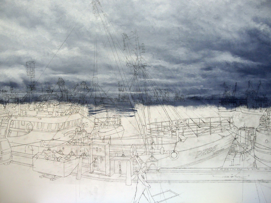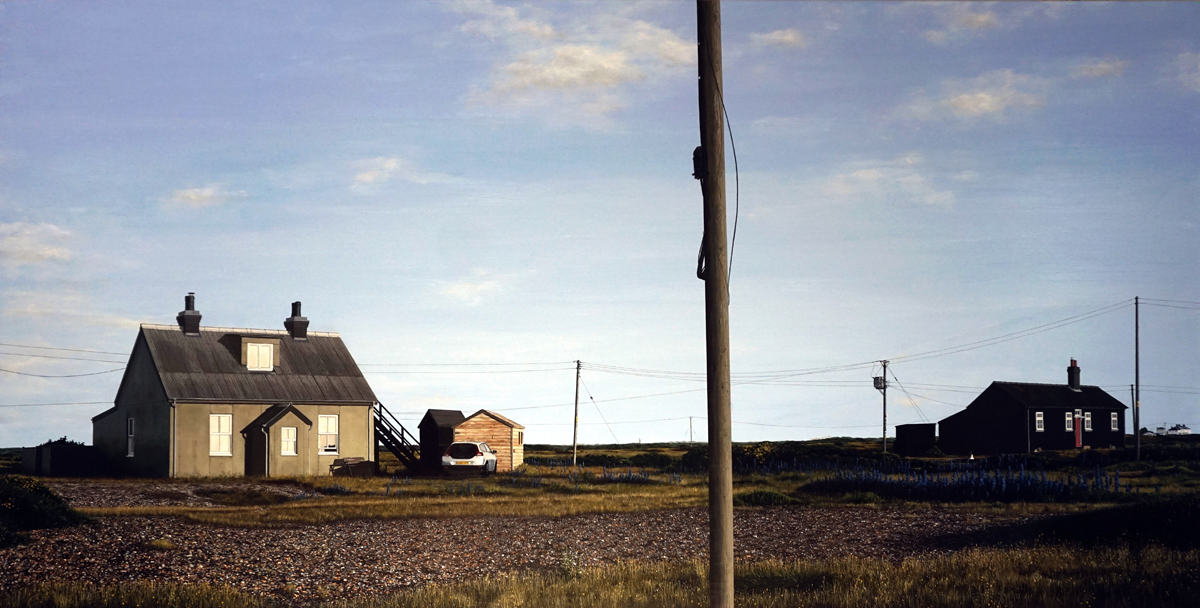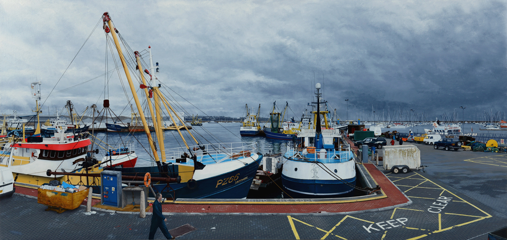 Reid’s process is simple but laborious. He begins by taking a number of photographs of scenes and landscapes that are familiar to him, and then selects the image that he finds most technically challenging. In the process of making Before the Storm (2015), for instance, Reid meticulously outlined every detail in the image before he painted it, and the result is a picture-perfect depiction of a harbor in Brixham, uncanny in its photographic quality. The question Reid faces is this: Why create paintings identical to photographs when he could paint from imagination? For Reid, his painting practice might be labeled as photorealist, but his interpretation of the images he chooses to paint has a narrative quality not always prevalent in photographs.