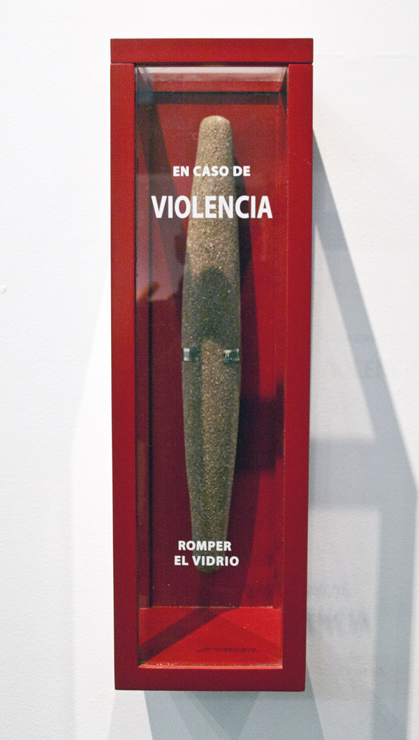 An easy-to-miss piece is Seguridad Civil (2014). It cleverly uses interpretative play and visual puns to reveal the stakes in Carrasco’s game. It looks exactly like a case for a fire ax or extinguisher. But instead of the expected text and contents, the artist places the words “en caso de violencia, romper el vidrio” (“in case of violence, break glass”) across the front, and mounts a metlapil inside. This play on expectations suggests that violence in the home constitutes a civil emergency, and that the metlapil is simultaneously a weapon, a symbol of power, and a signifier of the feminine body at risk.