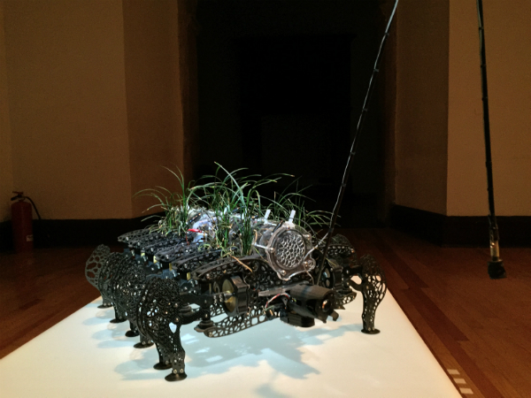 In PLNT_S NMD_S. Plantas nómadas [Nomad Plants] (2008–2014), an autonomous, multi-legged robot plays a leading role in the utopic quest for the improvement of polluted water and the rescue of native flora. With a special hose, this crawling device has the ability to suck wastewater and transform it on many levels. The water is filtered by microbial communities in charge of biodegrading organic wastes and eliminating toxic substances. With the energy this process creates, the mechanical critter recharges its battery and can walk around to look for more polluted liquid sources. On its back, many autochthonous plants grow, and the required and essential nutrients for their growth are obtained through the filtered water stored in the robot’s structure. A series of drawings that resembles a codex, MMVIII Fitocresta Errantis (2014), illustrates the robot’s origins, functions, and future hopes. A video of the piece being tested by the Santiago riverbank in Jalisco is also on display.