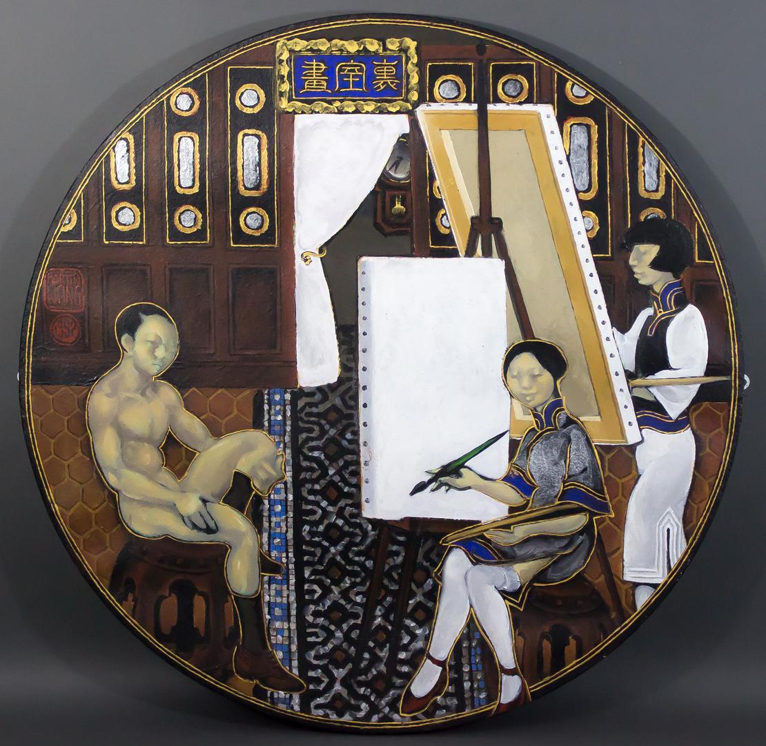 Martin Wong. In the Studio, 1992. Acrylic on linen. 30 inch diameter. Collection Bronx Museum of the Arts, Purchase, Asian American Art Fund 1998.1.4