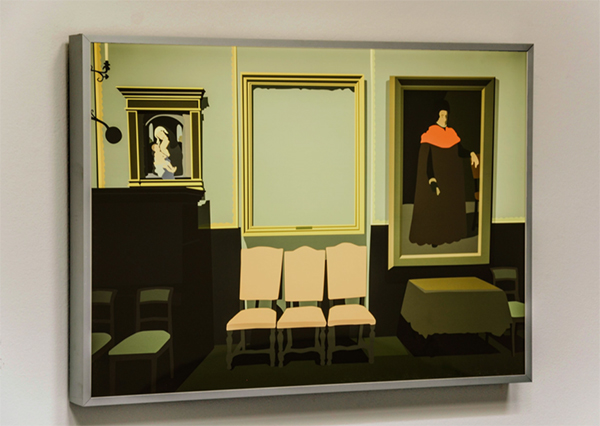 In the main gallery, thirteen lightboxes hold an illustrated image of each of the thirteen stolen works in their original sizes. Ezawa’s animations and illustrations consist exclusively of a handful of solid, flat colors without contour lines or gradation, as if he were painting by numbers but could only count to ten. The thirteen works are hung salon-style on one wall. A single lightbox, Empty Frame (2015), hangs on the opposite wall, holding a reproduction of a photograph depicting the empty frame from which the Vermeer was taken.