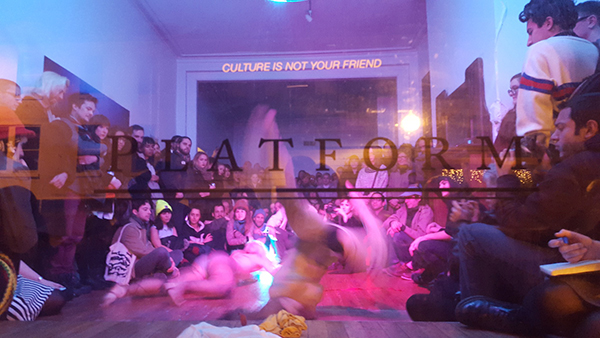 Today from our friends at BmoreArt, we bring you Angela N. Carroll’s reflections on FlucT’s performance Culture Is Not Your Friend at Platform Gallery in Baltimore, MD. Carroll says of the performance, “Much of what I experienced was performative in the most mundane and expected ways: a critique of sexuality by embodying overtly sexed archetypes. But maybe that’s the point.” This article was originally published on February 12, 2016.