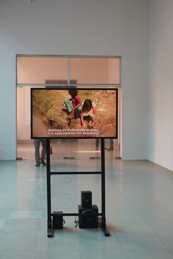 Even before entering the exhibition gallery, viewers are confronted with a video work by Zahin Karim and Chang Wan Wee on a large flat screen. Habitat (2013) has a Beatles soundtrack, and as viewers listen to the refrains of Sgt. Pepper’s Lonely Heart’s Club Band, they watch images of children living in the squatter settlements of Chittagong, Bangladesh’s second-largest city. The project was made in response to the destruction of a previous settlement, which was bulldozed to make room for an airport. A text included in the video explains that the new settlement is on public land that might be developed in the future, so these inhabitants are living with no money and very little security. Bangladesh, the birthplace of microfinance, is a poor country, yet Habitat is not a form of poverty sensationalism, but a moving treatment of its citizens’ lives, and was created by Bangladeshi and Korean artists. It was difficult to tell if the soundtrack was chosen as a feel-good lure to make people watch, or if it was meant to elaborate the excitement felt by the children, who did not despair but in fact enjoyed mugging for the camera and showing off their village.