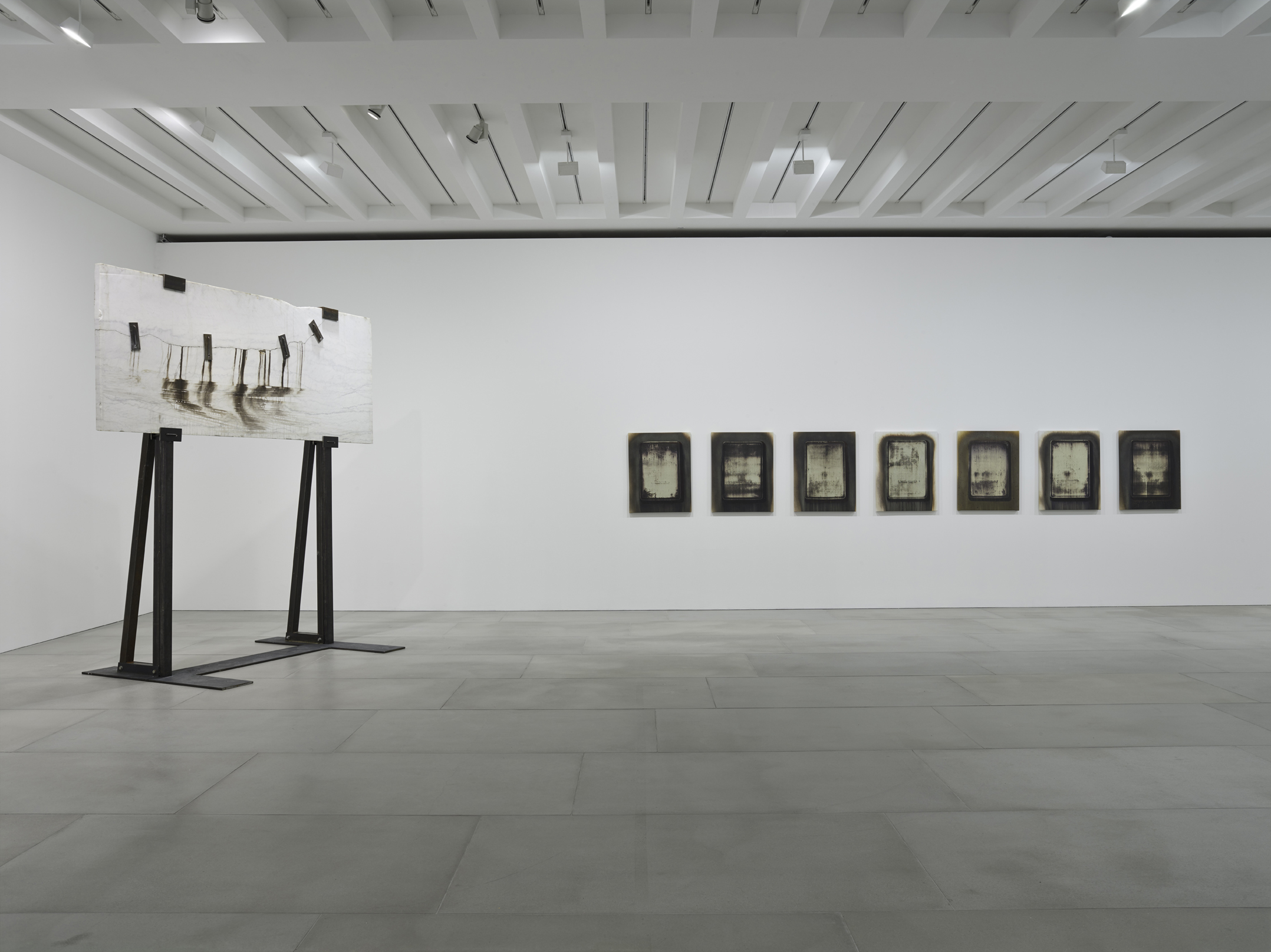 Joo employs silver nitrate elsewhere in the exhibition, too. Prologue (Montclair Danby Vein Cut) (2014–2015), a massive marble and steel sculpture, is coated entirely on one side with the material. Dark veins of silver nitrate streak down the marble’s striated surface, emphasizing not only the mechanical intervention that extricated the slab from a quarry, but also the jagged crack that divides the otherwise perfect chunk of marble into two.