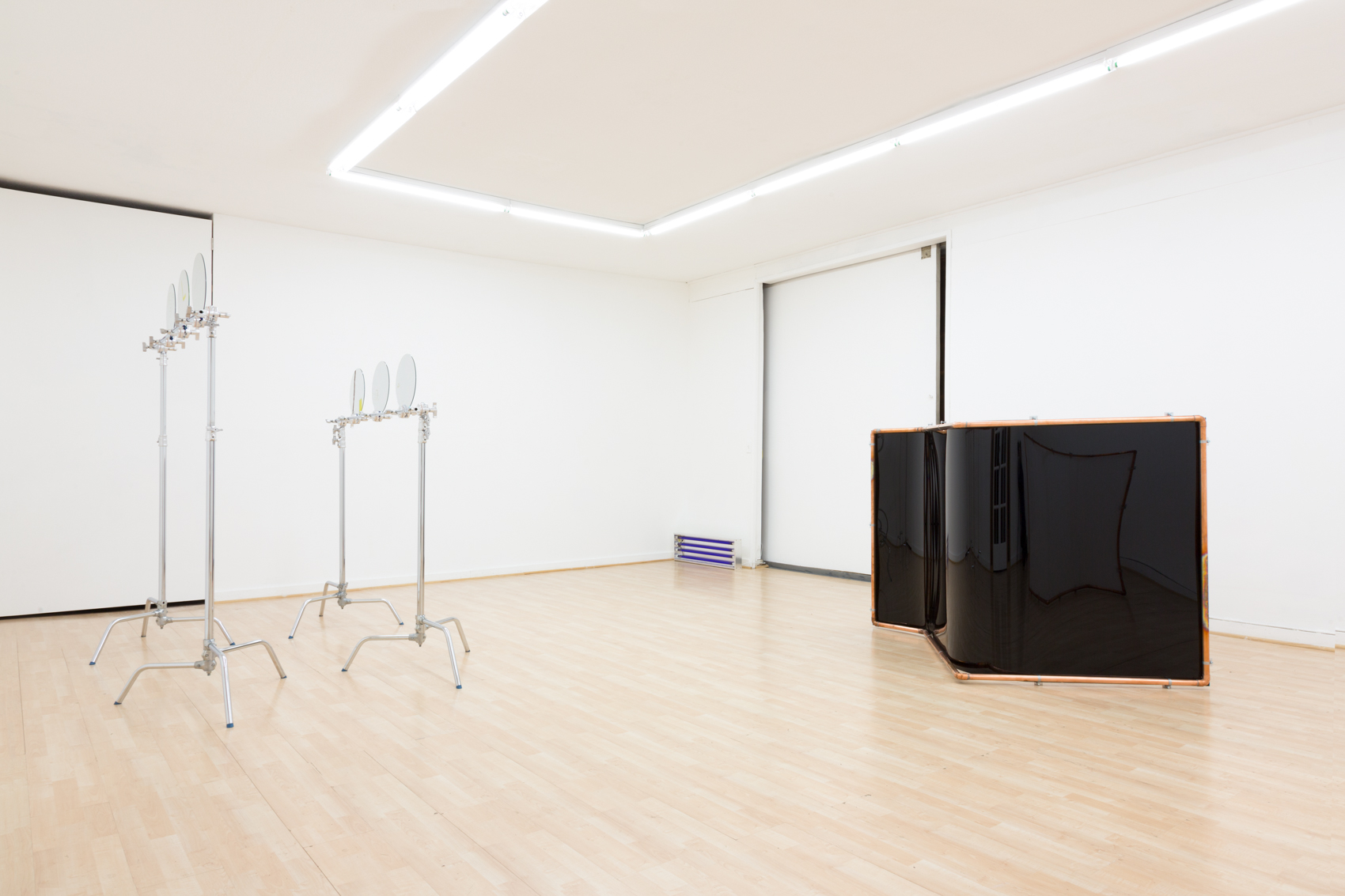 The first piece encountered is a knife impaled dart-like in the gallery door frame, its blade inscribed “PENTAX.” Around the corner, two playing cards are affixed to the wall with a nail; one bears the Canon logo. A pair of sizable floor-based works is positioned across from this piece. Each consists of an S-curved copper frame onto which is clamped a sheet of Plexiglas—one white, the other black. These pieces approximate “product scoops,” devices used to photograph objects against a backdrop of infinite whiteness or blackness. Stenciling on the copper trusses alludes to popular camera brands and slogans from dated camera ads. Diametrically across, a set of C-stands supports six circular mirrors, forming a silvery two-tiered sculpture almost eight feet tall. Four stacked “blacklight blue” tube lights in the corner are the final work in the show.