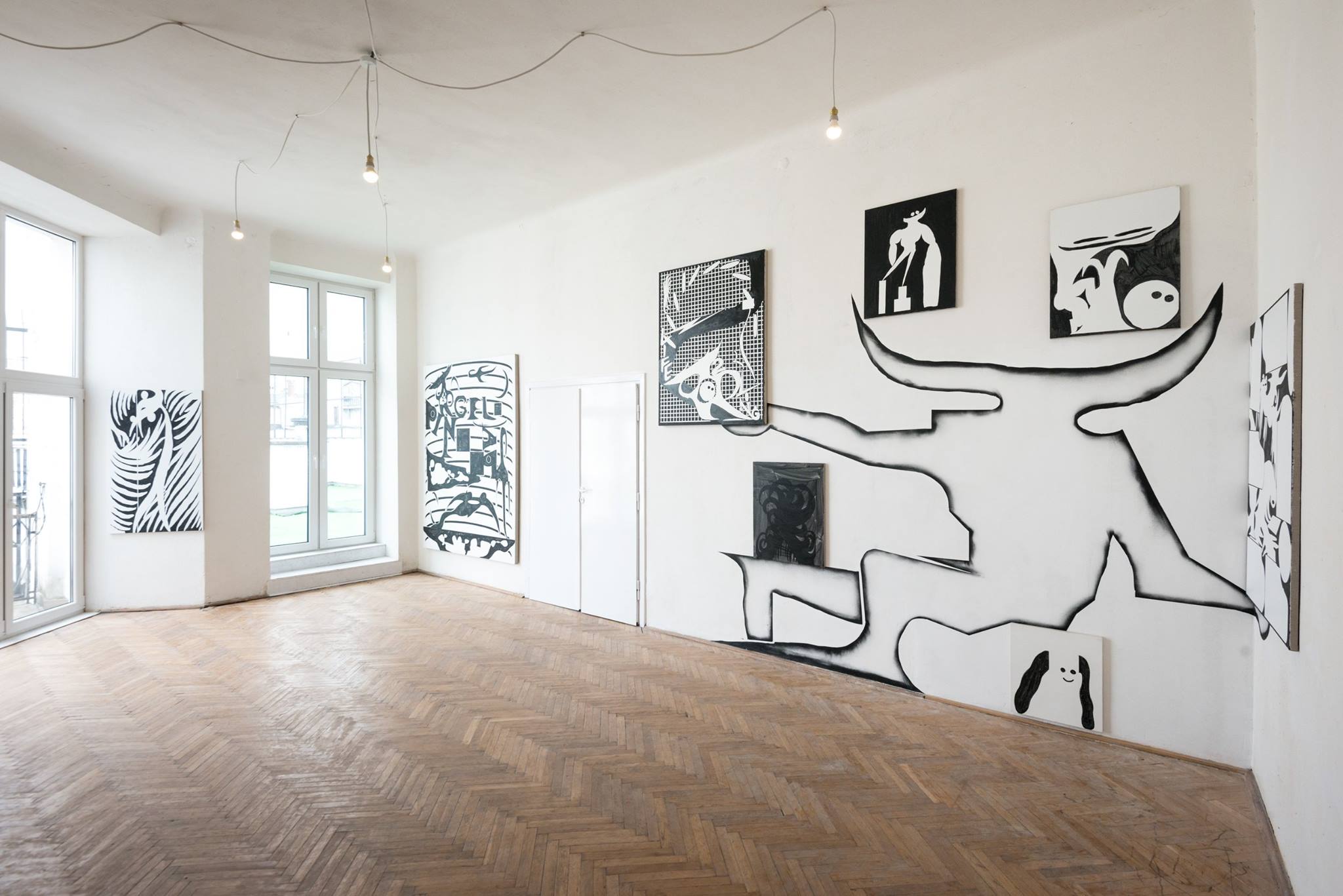 Cezary Poniatowski’s recent work at Piktogram Gallery compels viewers to navigate a veritable maze of pop-culture references and anthropological allusions. The exhibition is composed of more than twenty black-and-white acrylic paintings completed in 2015 and 2016, each depicting highly abstract, hybrid figures cavorting in confined, flat spaces reminiscent of comic-book panels. The recurrence of specific forms and motifs in the images creates the strong impression of a discontinuous narrative.