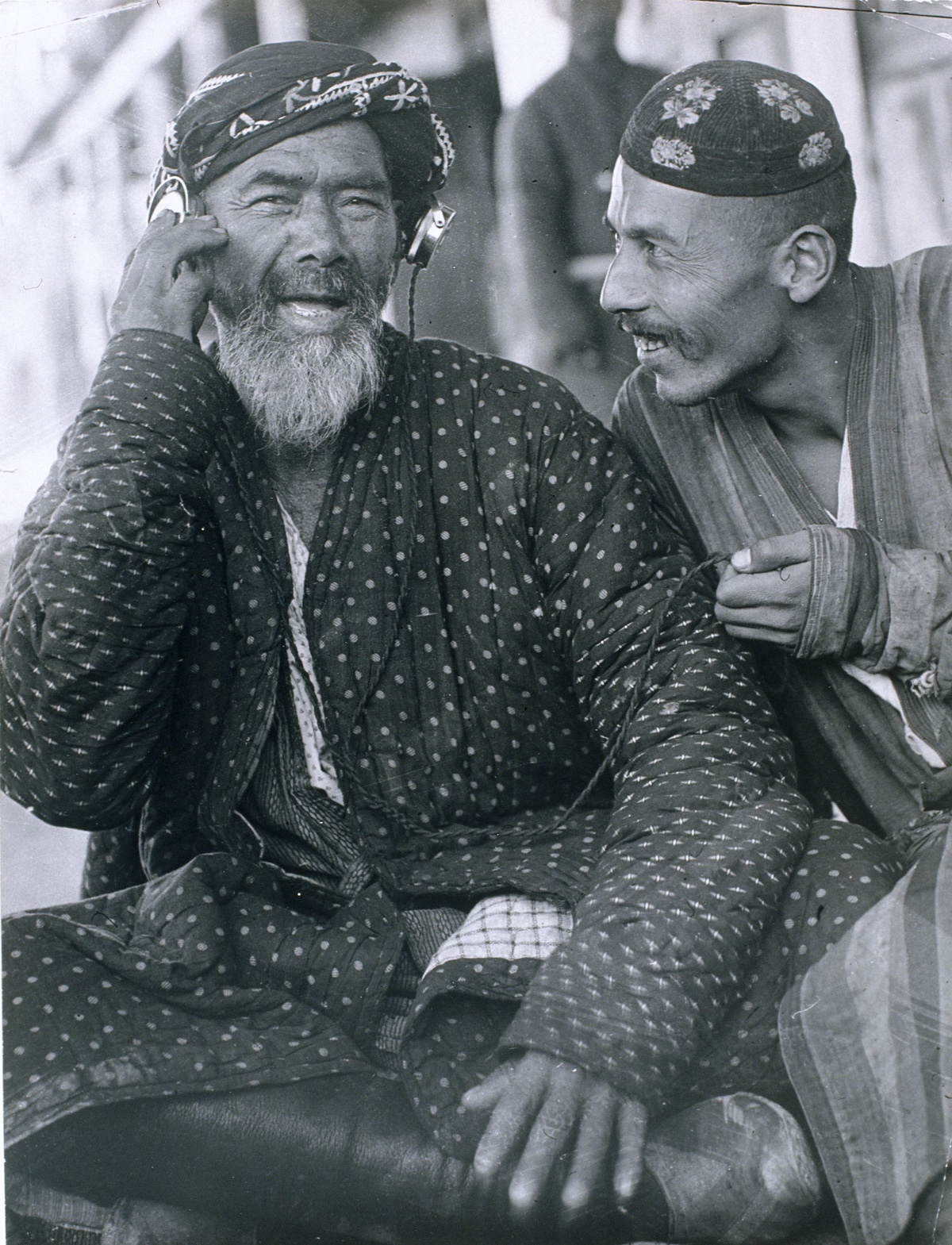 Georgy Zelma’s highly staged images present confrontations between “the old world” and the modern. They seek to enhance the arrangements of figures and objects for the greatest political impact and are excellent examples of the manipulations that photography faced during the later part of that decade. Zelma’s Voice of Moscow (1929) is a depiction of two Uzbek men in traditional dress handling a transistor radio. The image aestheticizes the encounter between man and technology during this period as a lighthearted, even humorous juxtaposition. Yet, as this photograph was taken, Stalin was systematically murdering many of his own citizens, often harnessing new technologies and communication devices to do so. The dark history of these images often speaks louder than the beauty and boldness of their visual aesthetic. The drama of Arkady Shaikhet’s iconic image Express from 1939 resounds as a metaphoric image of post-revolutionary Russia: a train pummeling through the Russian countryside at breakneck speed, rushing through time too quickly within a menacing cloud of steam and smoke.