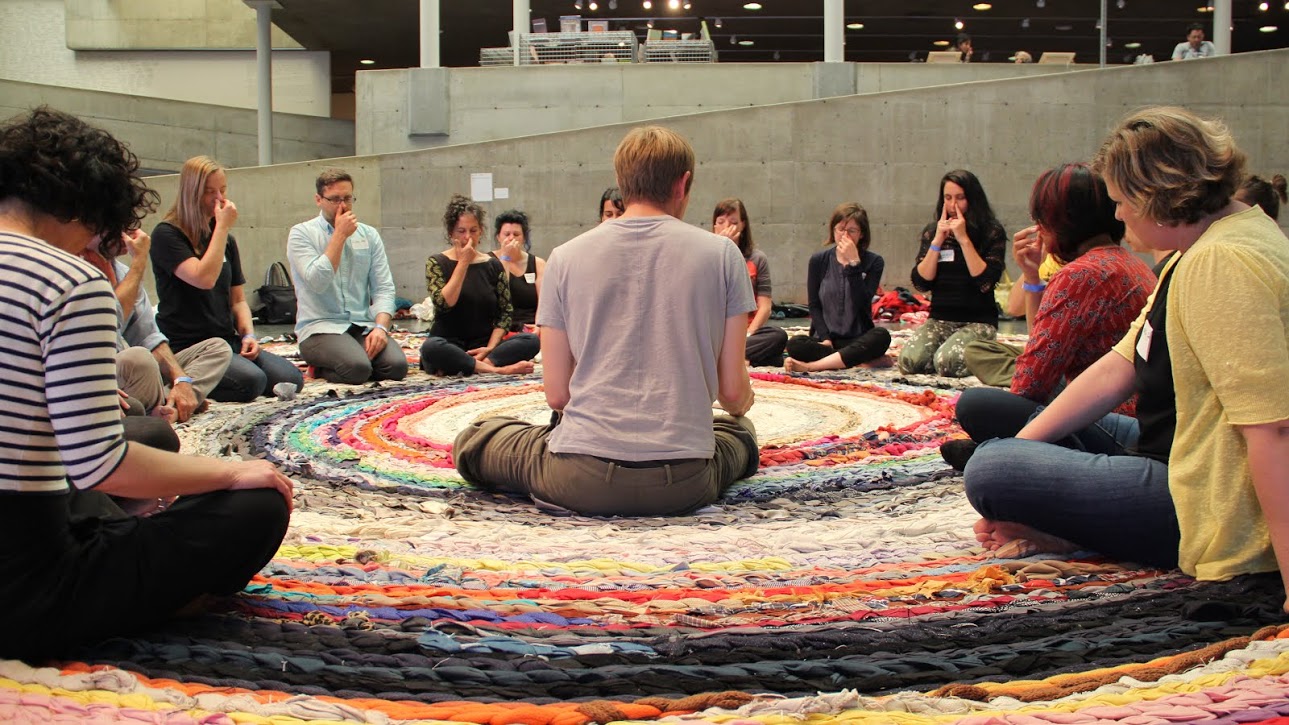 Christian Nagler. Yoga for Adjuncts, 2014. Workshop at Valuing Labor in the Arts: A Practicum. Courtesy of Arts Research Center, UC Berkeley. Photo by Joanna Fuller.