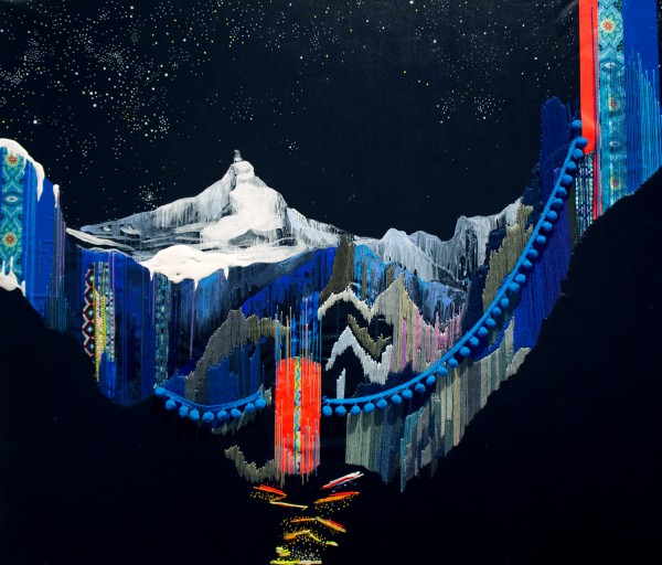 This assertion of immediacy may be a defense mechanism against the double vision present in Mattai’s pieces. They offer a kind of boundlessness while declaring a border, leaving the viewer to wonder at their frame of reference. Generally, I Don’t Think That Way II (2016) expands and contracts, extending from a central mixed-media embroidery work, to a painted mountain range truncated by an imaginary frame, which in turn is extended further by colored thread and rope affixed to the gallery walls. The rope drawing expands outward from the traditional perimeter of the painting, pushing beyond strict boundaries. The eye trips across multiple borders, simultaneously drawn in by the sumptuousness of the embroidery or the evocative texture of the brushstrokes while being stopped short by their finitude. It is only at the haphazard knots and trailing ends of the rope and thread that one is cast back from these landscapes into the gallery space. By maintaining a distance—the viewer’s prerogative—one can pull out from the tensions of the piece, yet this figurative “stepping back” provides a kind of rootedness that Mattai’s works themselves reject.