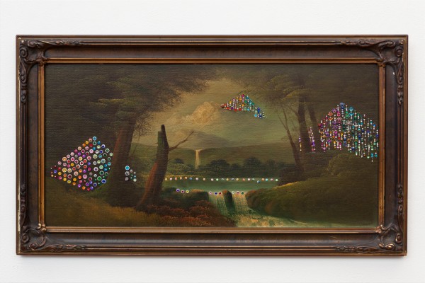 Suchitra Mattai. Misfit, 2016; bindis on vintage painting; 16 x 28 in. Courtesy of the Artist. Photo: Wes Magyar.