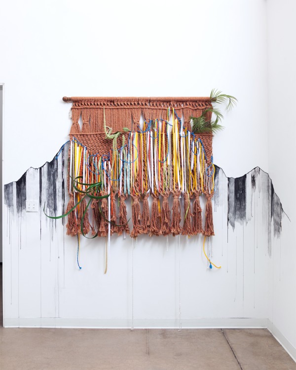 Suchitra Mattai. Indentured, 2016; fabric, rope, vintage macramé, graphite, and acrylic; 96 x 60 in. Courtesy of the Artist. Photo: Wes Magyar.