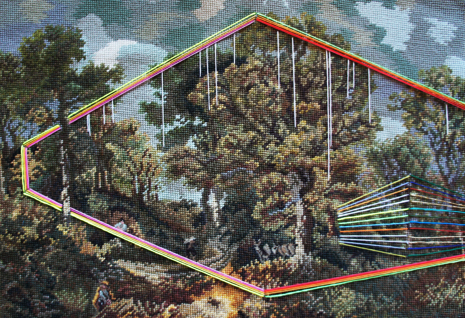 Suchitra Mattai. Imagine That, 2015; thread on vintage needlepoint; 17 x 21 in. Courtesy of the Artist.
