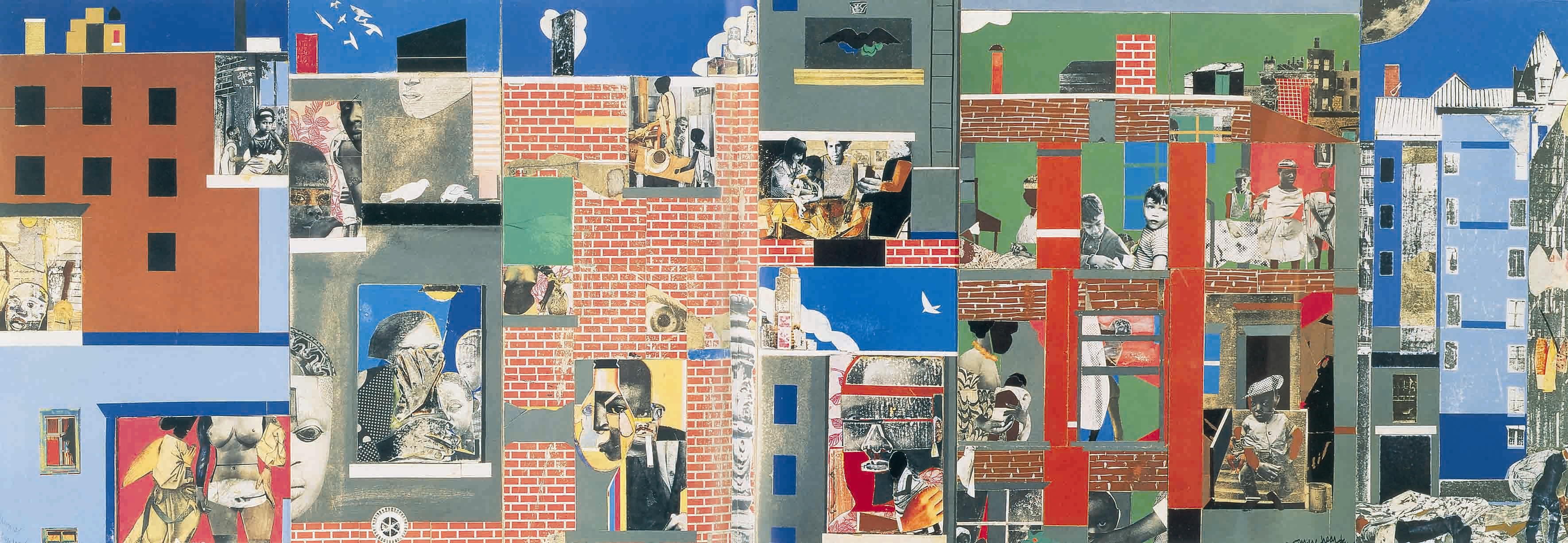Romare Bearden. The Block II, 1972; collage of various papers with foil, paint, ink, graphite, and surface abrasion on seventeen fiberboard and plywood panels. © Romare Bearden Foundation