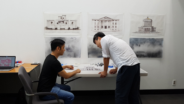 At his residency at the Seoul Museum of Art, Reyes is currently producing a series of drawings titled Indefinite Curfew. In these works, Reyes fragments statements made by undocumented activist and journalist Jose Antonio Vargas and places them underneath both fictional and actual buildings. In one piece, the statement “This deceit never got easier” sits under a neatly rendered architectural drawing of the clock tower from Back to the Future. In another, the building that houses Alameda County’s Superior Court is captioned with the sentence, “If anyone asked why I was coming to America, I was going to Disneyland.” The buildings are at times fraught with enduring political weight. Placed with the texts from Vargas, the drawings question borders, notions of truth, and the monuments that hold both our desires in how we place ourselves in the world and what we might call home.