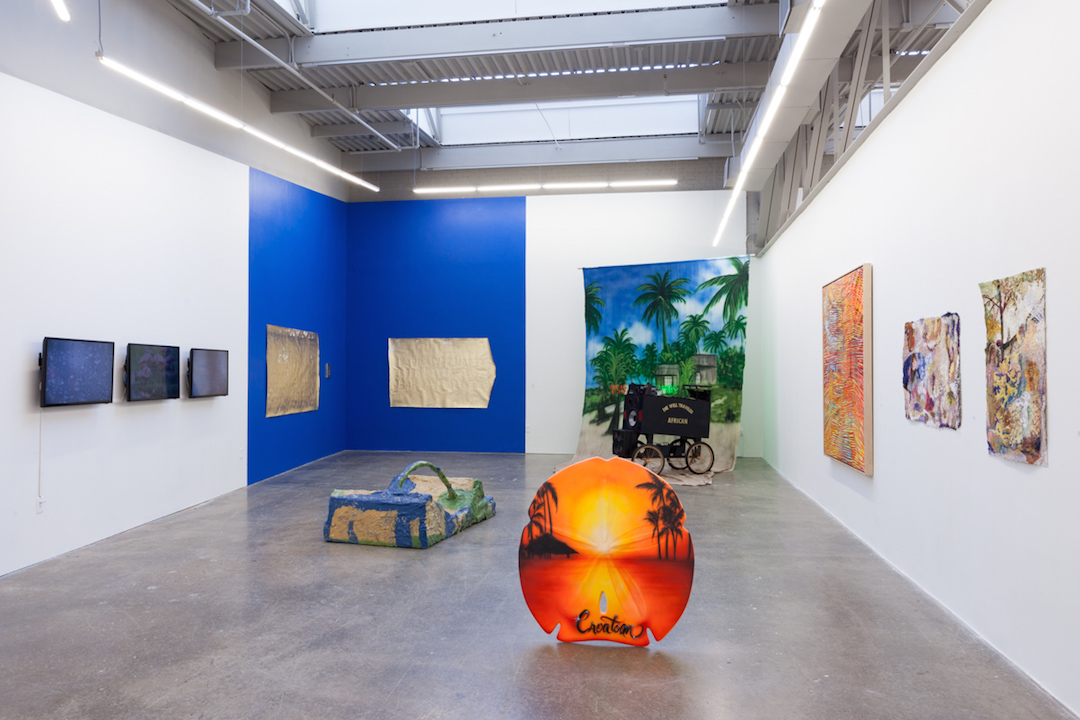 Though the exhibition excels at presenting a large number of artists who deserve greater visibility, it suffers due to the sheer number of works. Featuring multiple works by more than thirty artists, the exhibition’s walls are crowded. Larger works, such as Kalup Linzy’s touching The Queen Rose Family (2016–ongoing), can barely be seen apart from other works around them. Such proximity magnifies awkward curatorial decisions. For example, a viewer may group together one of Mayer’s sculptures, Waddell’s gold-leaf works, and a suite of video montages by Daniel Newman called Lost Flip-Flop (2016). These works, while intriguing on their own, struggle to effect any meaningful dialogue when seen together