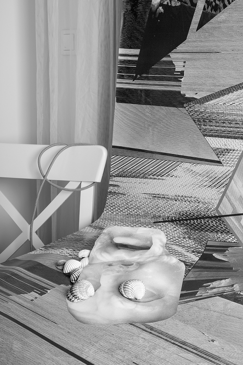 It can be difficult to tell which parts of Ewa Doroszenko’s works are digital and which are physical, though perhaps this lack of distinction is what makes her series The Promise of Sublime Words most potent. By combining digital and analog processes so seamlessly, Doroszenko’s practice blurs their boundaries to the point of meaninglessness. The result is a body of work that demands a reevaluation of its aesthetic significance: What would it mean to equate digital renderings with IRL arrangements, to smooth out their differences and claim that a Photoshop manipulation is no different from a physical fold or tear?
