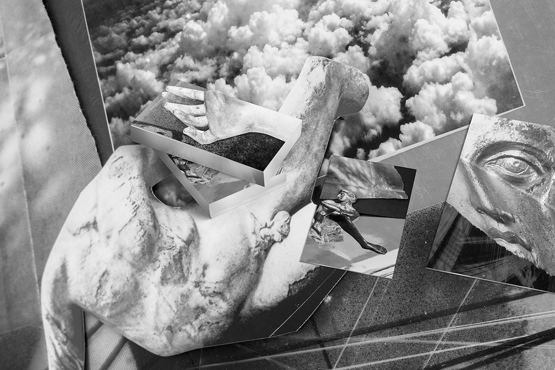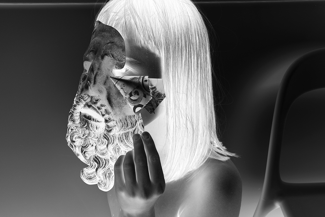 Such confusion extends to the abstract content of the series. It is difficult to describe what is going on in each of the images. In one, a feminine figure depicted in a black-and-white negative appears to hold a partial paper mask of a bearded statue over her face. Yet at one corner of the mask, there appears to be a folded piece of paper adorned with another ambiguous image; its placement confuses the eye’s perception. If one’s eyes follow the edge of the mask, it becomes unclear which piece of paper the model is holding—or if she is holding anything at all. The inverted tones of the negative image further distort the steps in the production of the image; the aspects that were staged in situ versus those digitally manipulated and added later are difficult to identify. The muddling of classical-art figures within Doroszenko’s dizzying collages symbolically throws traditional aesthetic meaning into a blender, leaving viewers to parse the work’s existential arguments on their own.