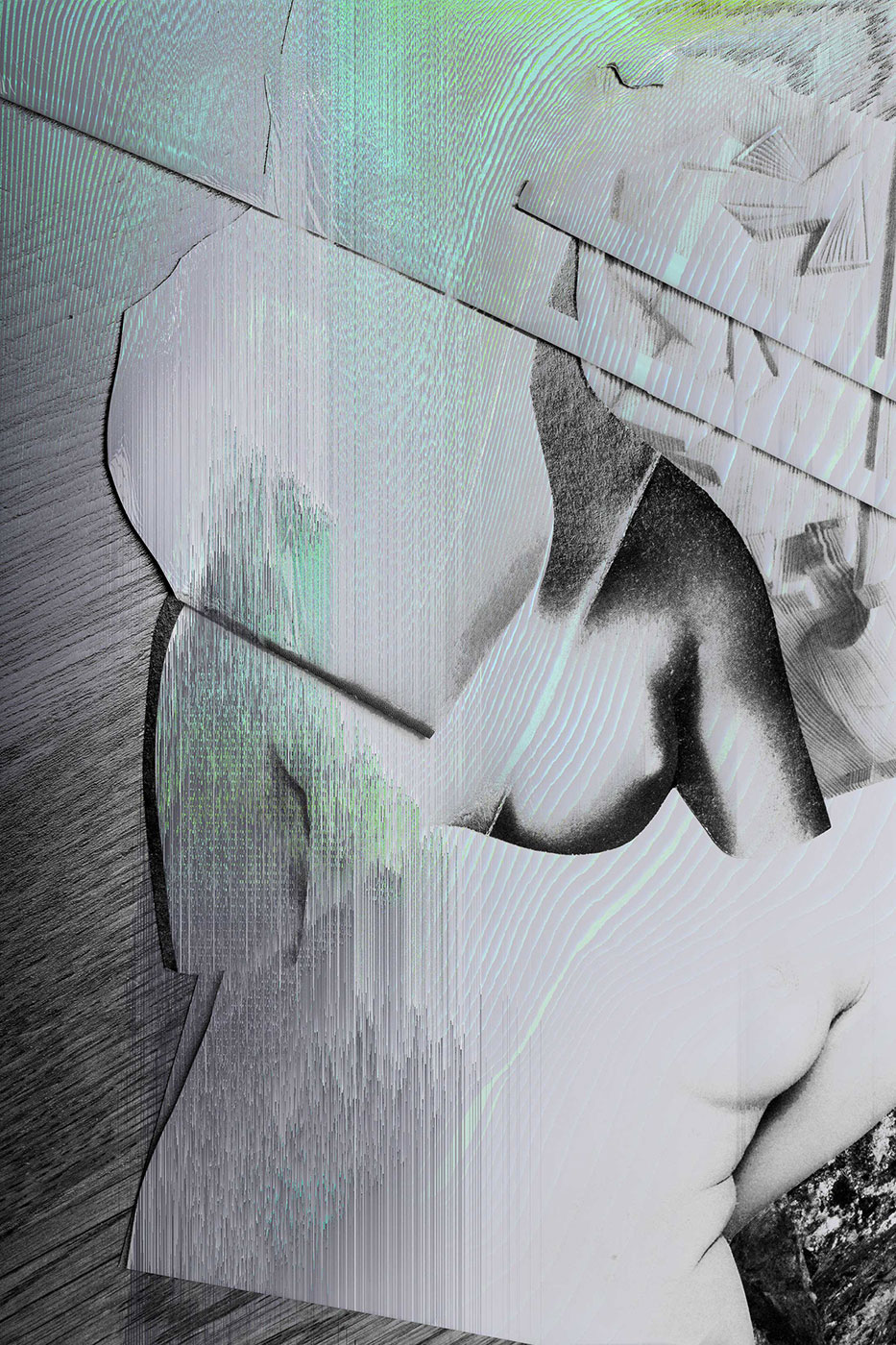 Though most of the recognizable figures in the series come from distortions of classical Greco-Roman sculptures, there is something quite cyberpunk about The Promise of Sublime Words. Like that science-fiction genre, one of the ultimate questions of the series is the relationship of the body to media. Perhaps the only arguable distinction between digital and analog is what the hand can touch: If the work itself can move so effortlessly between the screen and real space, where does a viewer stand, both literally and figuratively, in relation to such fluid pieces? Is the physical necessarily left behind, abstracted in translation to the digital screen? Perhaps the muddling of analog and digital processes in Doroszenko’s work is not an assertion of loss (or freedom, depending on where one stands on that ontological divide), but rather one of imbrication. The Promise of Sublime Words could not exist without both the tangible and the intangible. Maybe an answer to Doroszenko’s existential questions is nestled between the digital and analog paper cuts and folds, each wholly inextricable from the other.