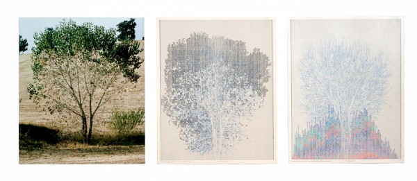 Charles Gaines. Falling Leaves #10, 1978; color photograph, ink on paper. Three parts: 20 × 16 inches each. Courtesy of the Hammer Museum. Photo: Randy Vaughn-Dotta.
