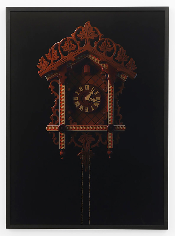 In other works, Murata places his digital models floating against a black backdrop—a recognizable standard when viewing and checking digital proofs. Each object’s surrounding darkness frames it within the conventions of digital production. Yet, if these images are meant to simulate traditional photographs, then why these objects, and what importance do they have? Separately, the pictured objects seem arbitrary: an ornate cuckoo clock, a zoomed-in and cropped image of suspended handcuffs, and a smooth candlestick complete with flame, to name a few. But no clear narrative or connection reveals itself conceptually other than their peculiar digital origins. If these are to be already understood as digital models, then what separates them from the slew of video-game avatars and film effects easily accessible from our personal technological devices, and elevates them into artworks? Why print them as photographs, rather than display them on monitors? These questions of context and association construct a mystery about image production that Murata does not seem concerned with answering, only providing more possibilities to entrench the viewer at arm’s length from a coherent or satisfying conclusion.