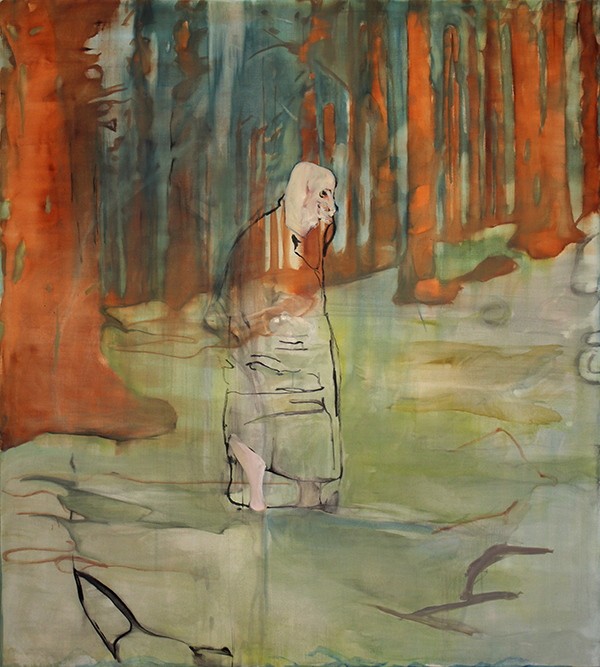 Ragnar’s work exhibits a clear influence from Expressionist artists while presenting something fresh and unique. The terror and anxiety present in certain iconic Expressionist works is mostly absent, but an aura of uncertainty persists. The hard lines of Egon Schiele and Erich Heckel are apparent, which at times also seems to be a nod toward printmaking. Many of Ragnar’s works, however, diverge from the relatively realistic subject matter of the Expressionists, approaching something that resembles folklore. Though anthropomorphic, the subjects in many paintings don’t seem fully human. The artist employs thin layers of paint to expose underdrawings, with only partial background areas blocked in. His paintings appear intentionally unfinished, resulting in an ambiguous psychological feeling.
