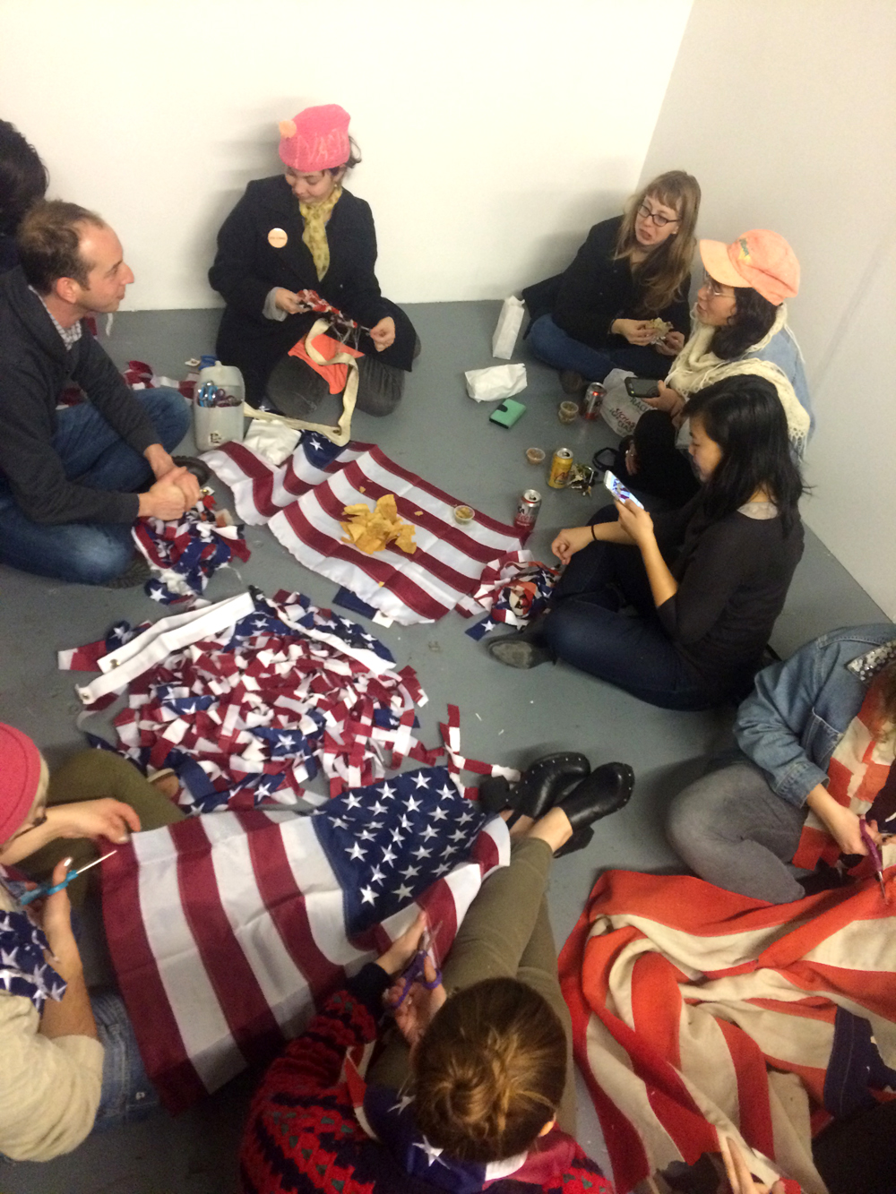 April 30 is the last of Donald Trump’s first 100 days in office. To mark that inauspicious event, I spoke with Kenneth Lo, artist and social media manager for 100 Days Action, and artist Ricki Dwyer, who contributed the intervention Shred and Re-weave the American Flag. Our discussion ranged from how resistance efforts have changed since the inauguration, to the role artist–activists play in those efforts either by choice or a sense of obligation.
