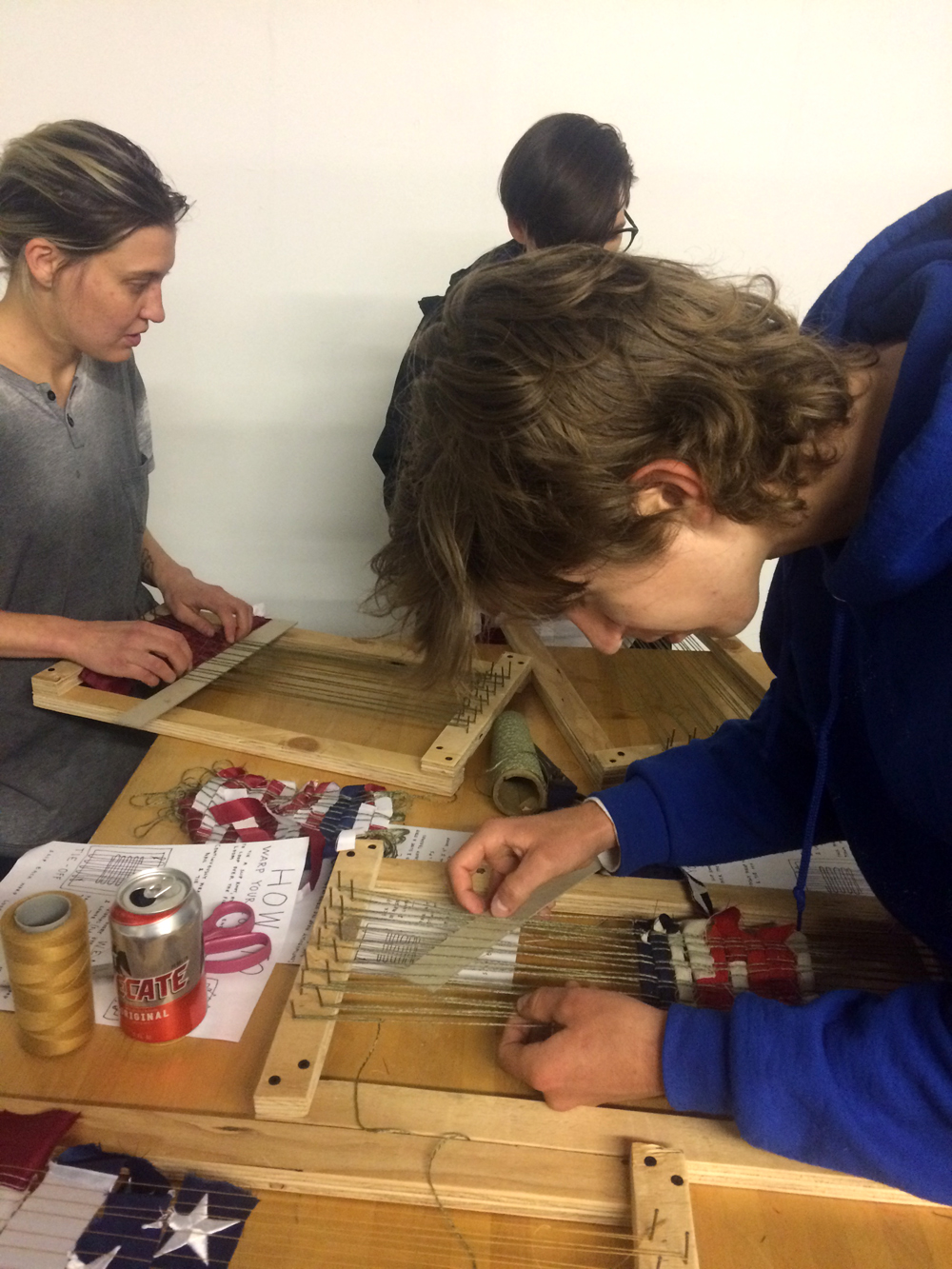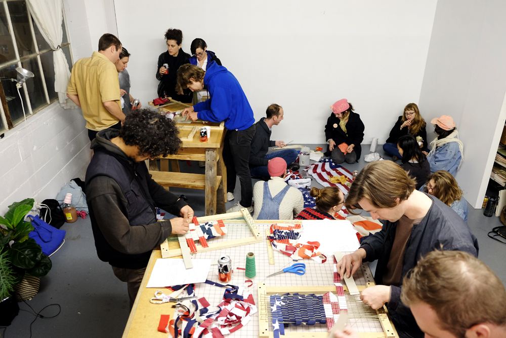 Ricki Dwyer. Shred and Re-weave the American Flag, 2017; participatory action, performed on January 27, 2017, at Open Windows Cooperative in San Francisco, as part of 100 Days Action. Courtesy of the Artist.