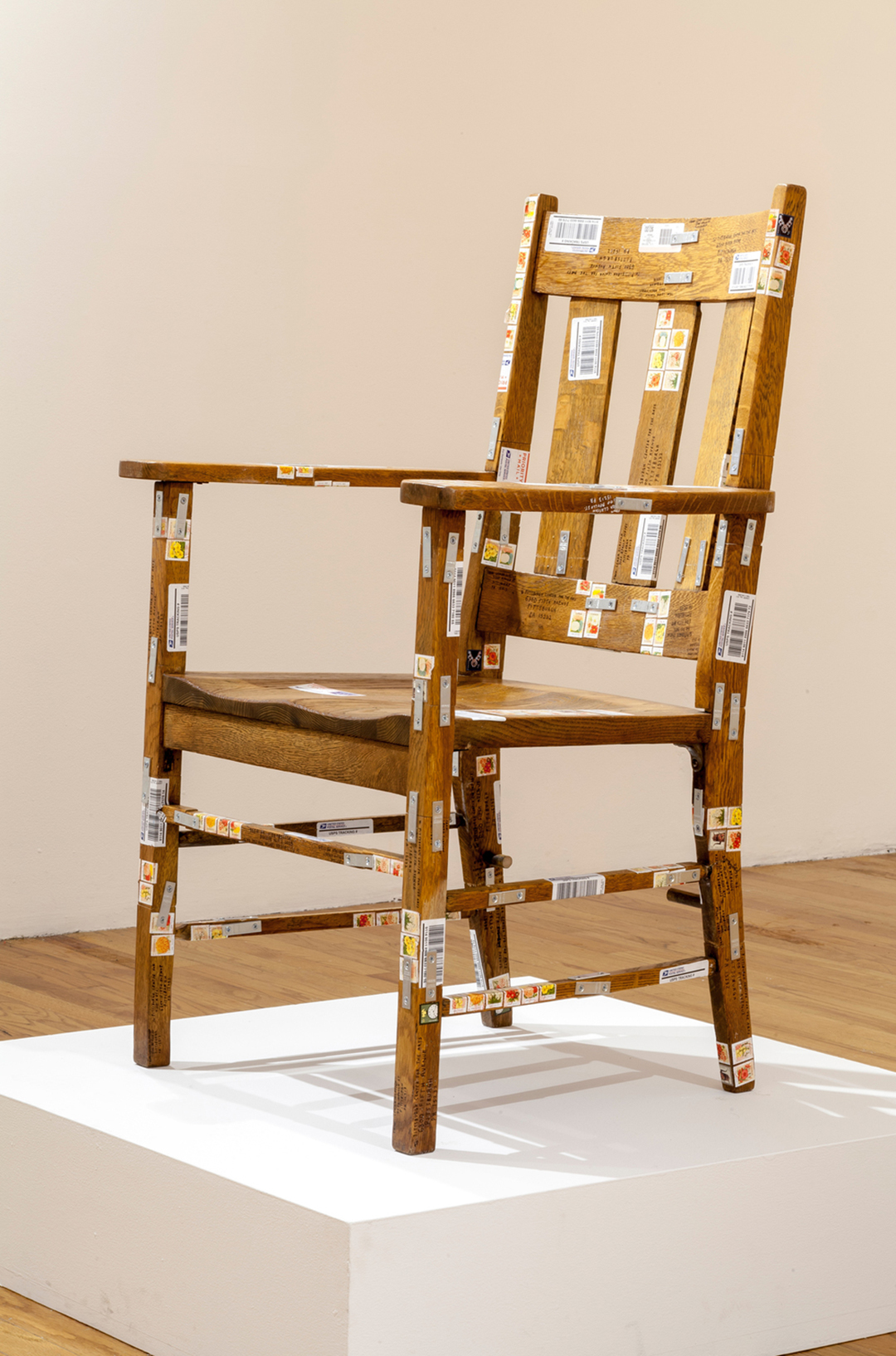 Lenka Clayton. Posted Chair, 2014; oak chair, steel mending braces, screws, postage stamps, labels, ink, United States Postal Service. Courtesy of the Artist. Photos: Tom Little.