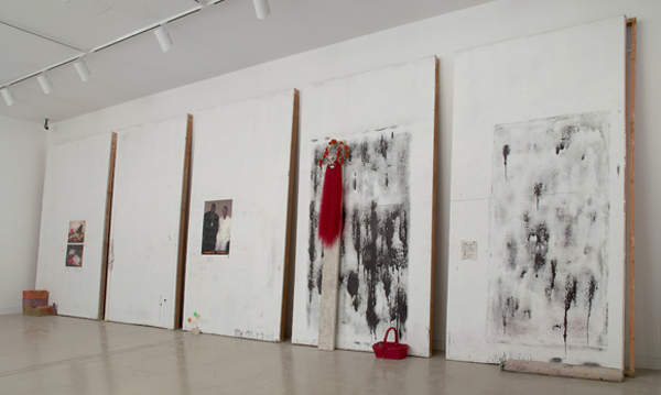On Tuesday and Wednesday, February 9 and 10, Mumbai-based Nikhil Chopra performed Yog Raj Chitrakar: Memory Drawing XI in the MCA galleries. Chopra brought the artist’s studio into the gallery using a variety of costumes and props, and wall drawings that he created during the performance. These will remain in the gallery as an installation for the duration of the Production Site exhibition. During his performance, Chopra assumed the fictional persona of a Victorian-era figure named Yog Raj Chitrakar, who is based loosely on his grandfather. His last name, Chitrikar, literally translates into picture- or mask-maker in Sanskrit. Chopra inhabited this character for the two days, changing into masculine and feminine costumes that challenge assumptions about race and gender. While performing, Chopra made drawings that reflect on Production Site, blackening the walls with his obsessive charcoal drawings to emphasize the studio as a place where an artist’s internal anxieties and struggles are confronted and resolved.