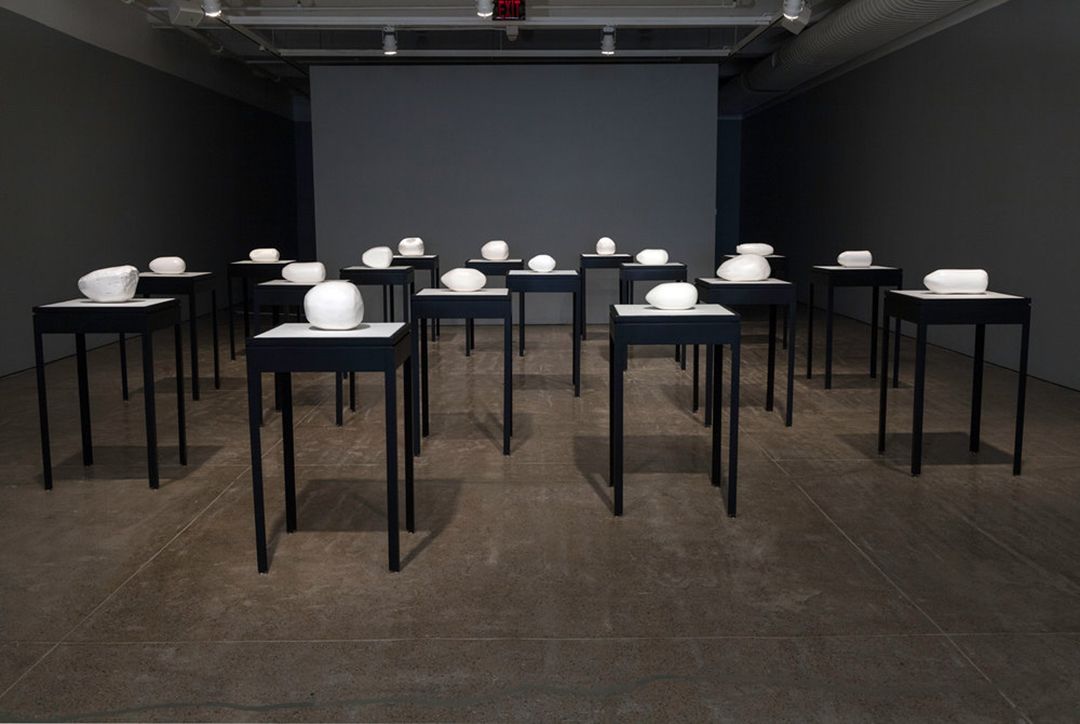 Because the sculptures are made out of reflective material, an interesting phenomenon arises as viewers engage them. Instead of possessing the gravitational effect of monuments, Farmanfarmaian’s sculptures expel everything, light and interpretation included. Due to this reflectivity, semblances of other gallery visitors and features momentarily appear and vanish; the sculptures eschew a static appearance and become ever-changing interpretations of the world around us. Furthermore, they take on several qualities of Op Art, as they similarly employ systems and lines to seemingly warp their own version of space. Despite the hard-edged geometric properties of the sculptures, stunningly expressive reflections are created on the gallery’s ceiling and floor, resembling the vivid, harried lines of Cy Twombly or Joan Mitchell.