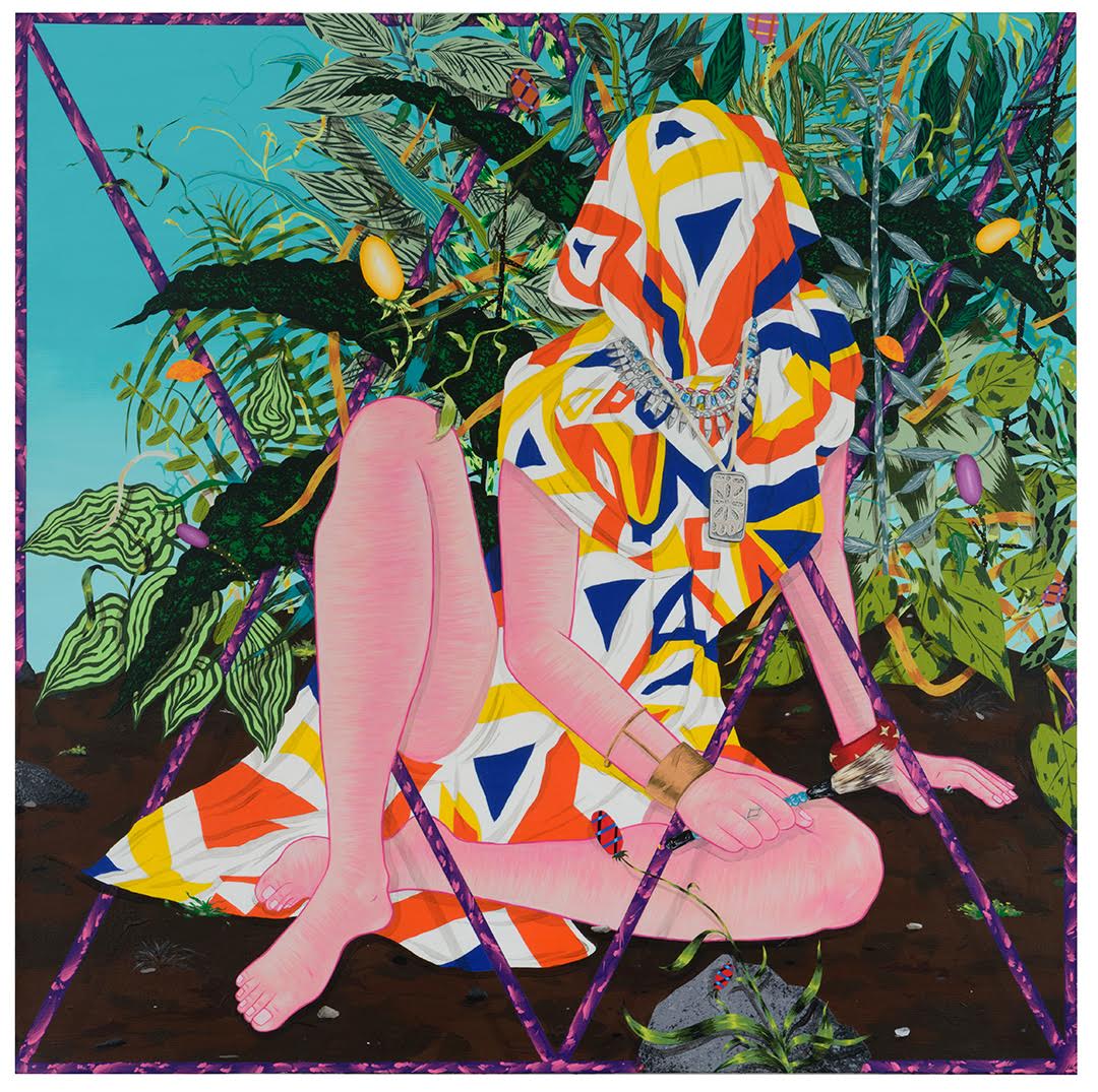 Amir H. Fallah. Moment of Reflection, 2016; acrylic and collage on paper mounted to canvas; 48 x 48 in. Courtesy of the Artist and Shulamit Nazarian Los Angeles.