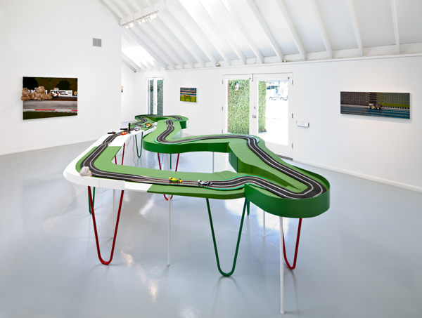 Car art has been more skin-deep than guttural lately. Artist Lisa Anne Auerbach, an adamant bicyclist, recently bought herself a car to drive to her new job in Pomona. In response to her own digression, she knitted a green sweater. On the front, above bicycles and happy hand-holding accordion people, it says, “I used to be part of the solution”; and on the back, which is bogged down by knitted cars, it says “Now I’m part of the problem.” This Spring, artists Folke Koebberling and Martin Kaltwasser began rehabilitated sedans by turning them into bikes at Bergamont Station. On designated days, visitors could come watch a process that resembled a mini demolition derby. Jedediah Caesar turned a red pick-up truck into an overgrown, inorganic ecosystem for the California Biennial last year. The pick-up felt apocalyptic.